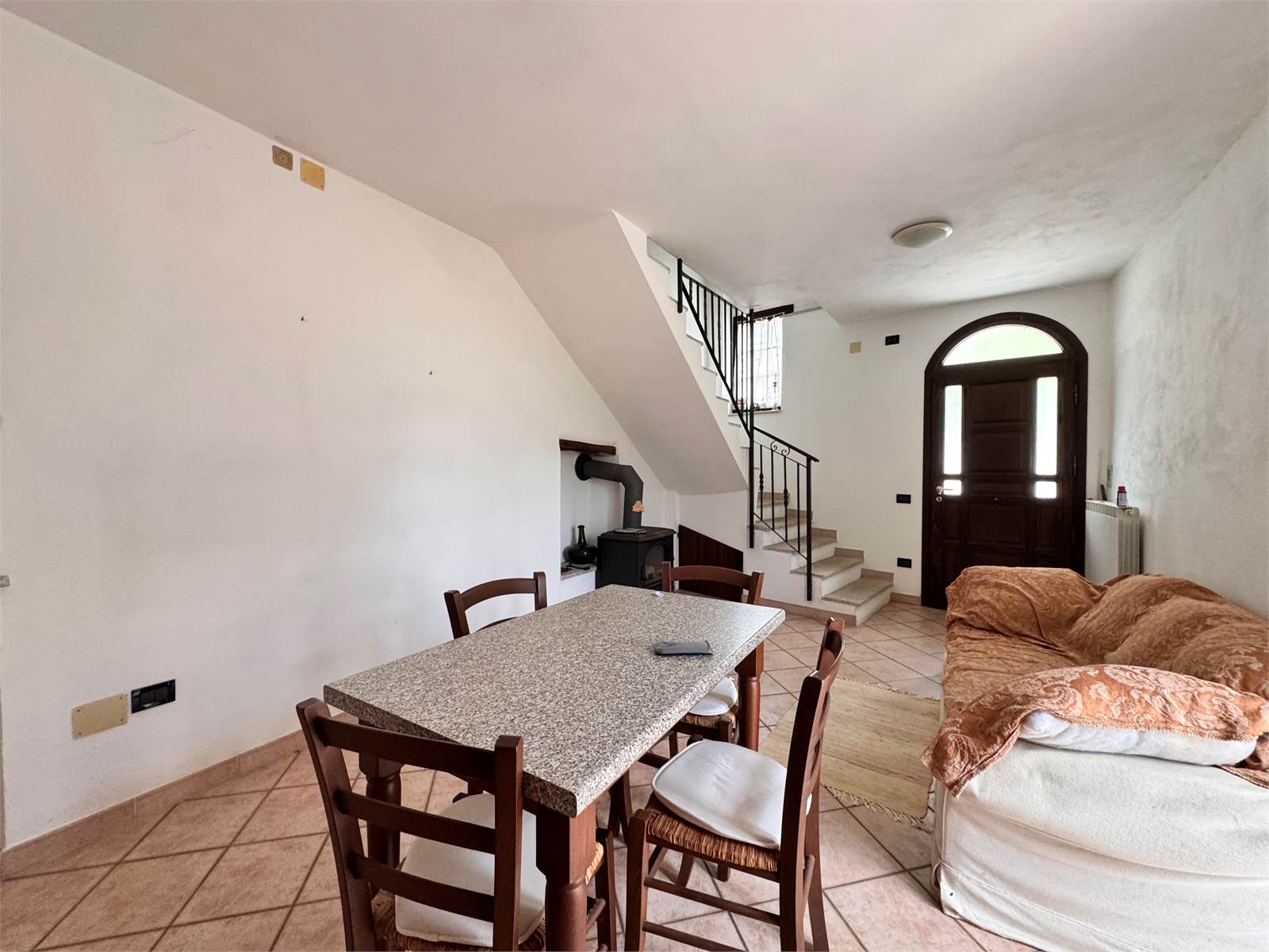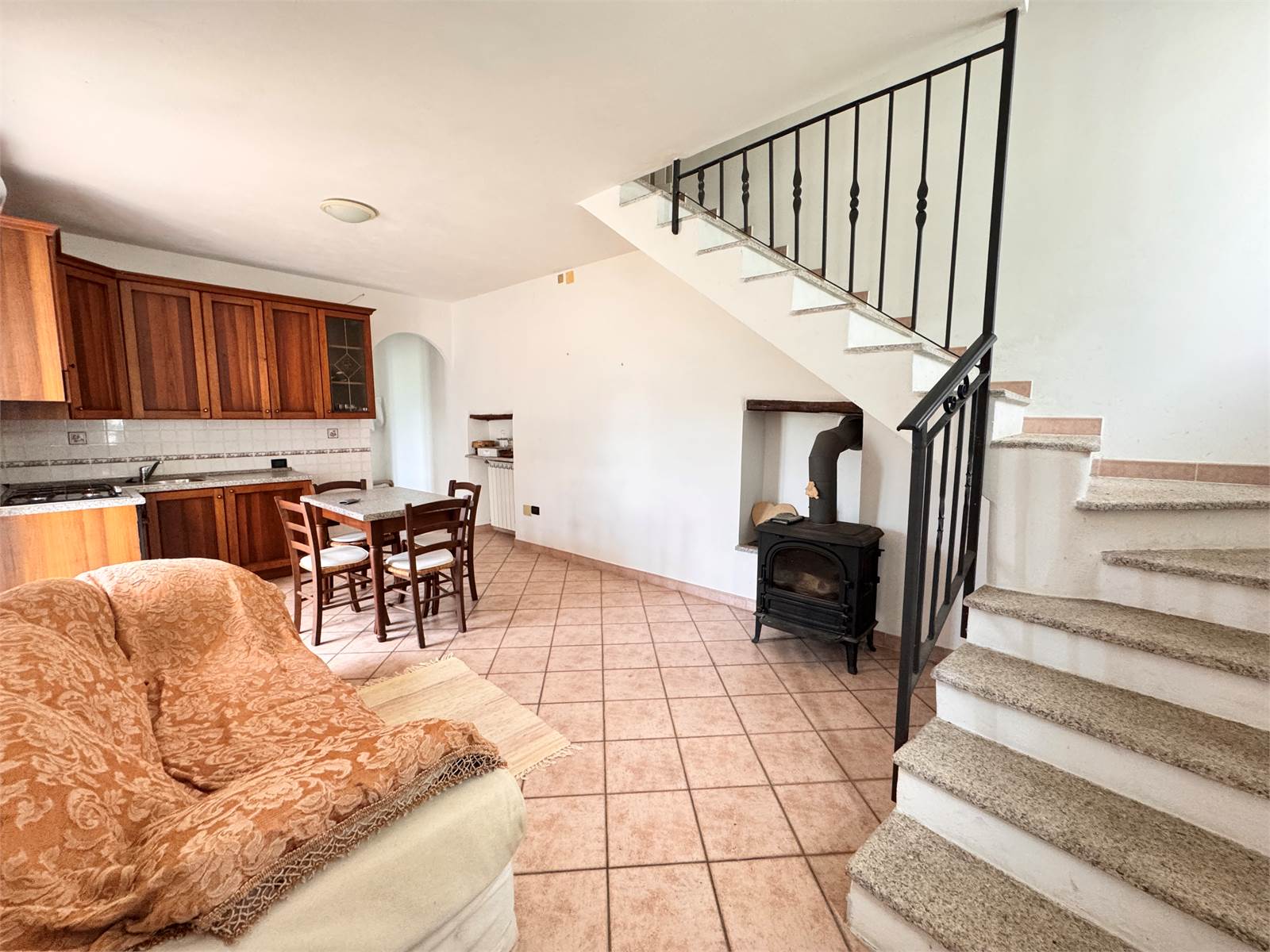 La zona giorno al piano terra è composta da un ingresso direttamente sul soggiorno con cucina a vista e un bagno finestrato e accessoriato con vasca da bagno. Tramite una porta finestra posta in cucina si accede al terrazzo dell'abitazione con vista aperta sulla valle sottostante.