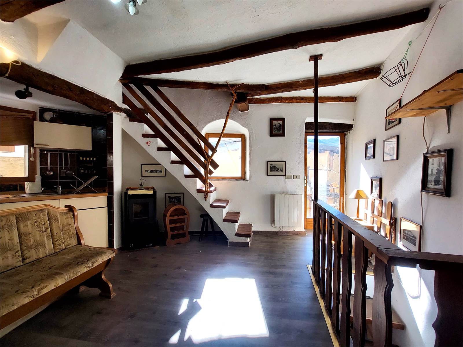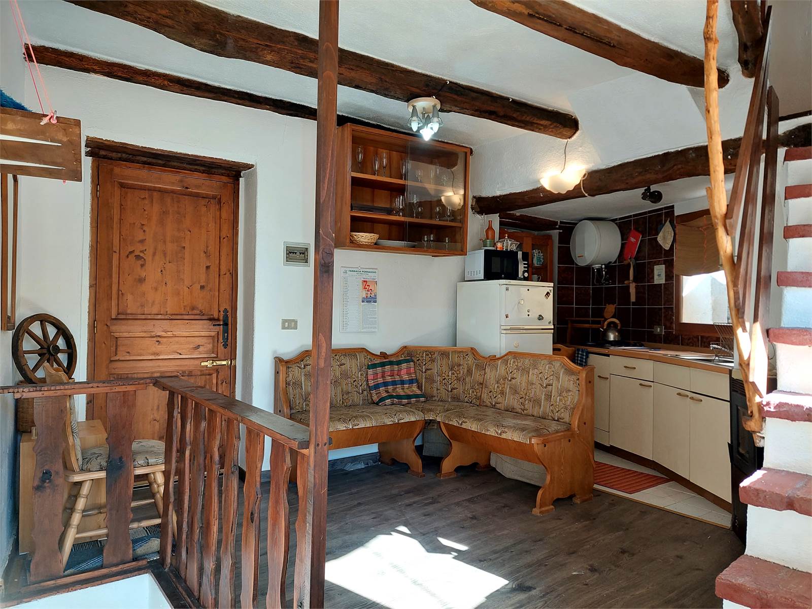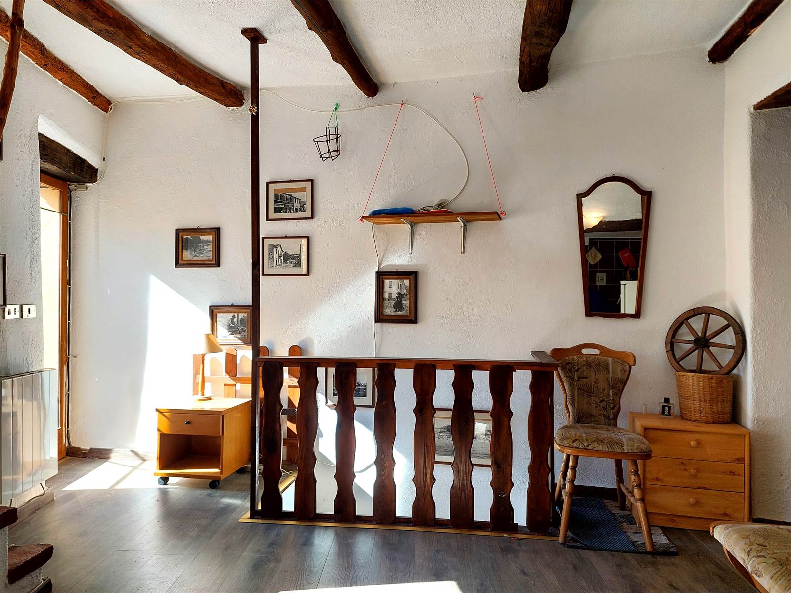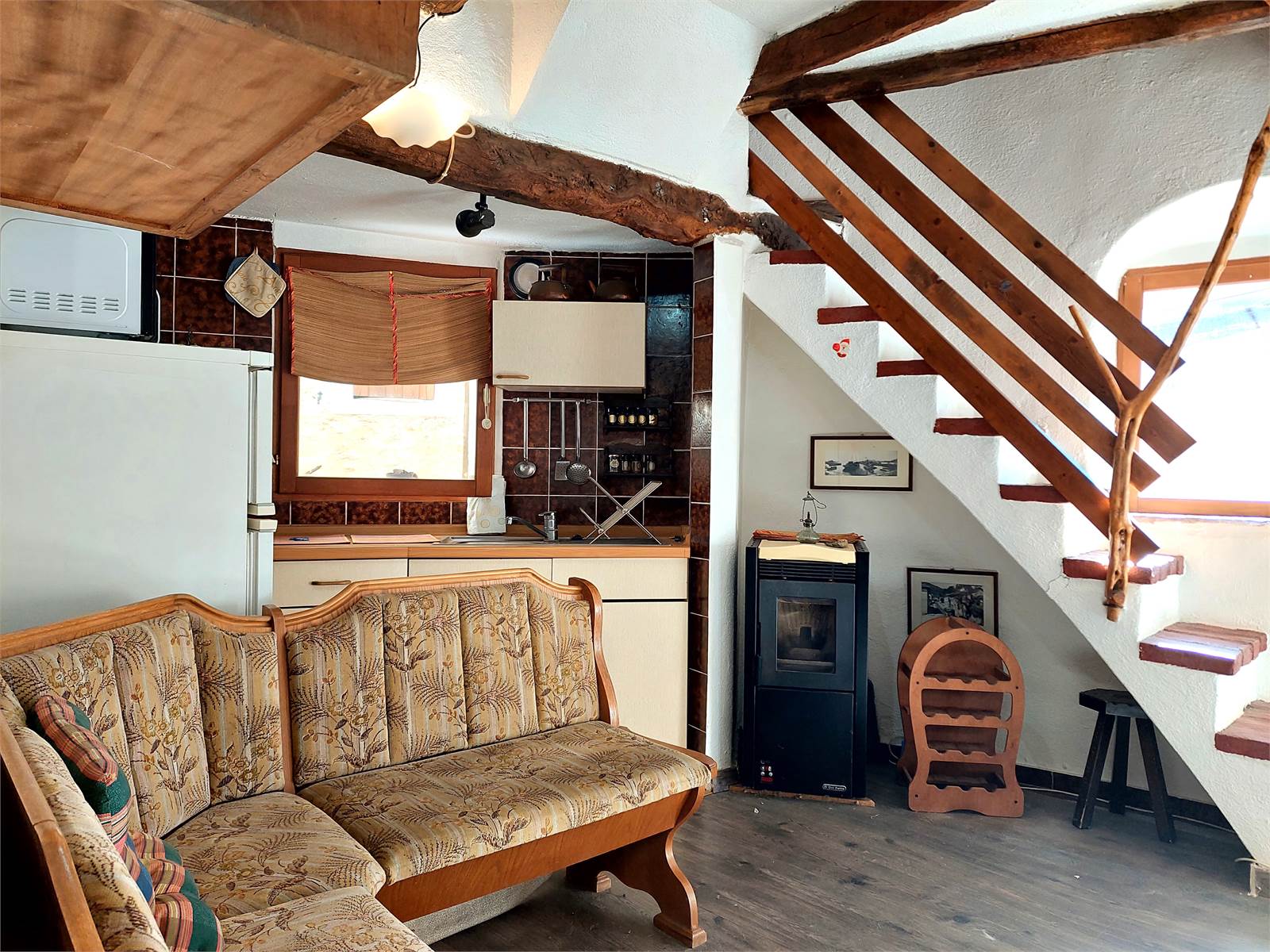 L'ingresso dell'abitazione è indipendente e conduce direttamente nella zona giorno. Soggiorno ed angolo cottura sono suddivisi solo da un muretto a mezz'altezza e hanno la particolarità del soffitto rifinito con travi in legno a vista. L'ambiente è reso luminoso grazie a finestra e porta finestra rivolte a merdione. Il balcone in pietra e ferro battuto gode di vista panoramica sulle montagne e sui tetti del villaggio.