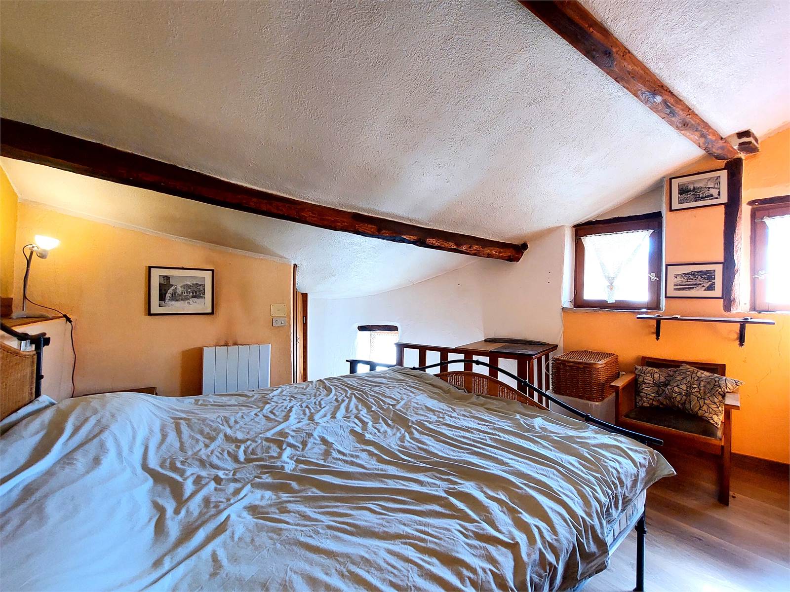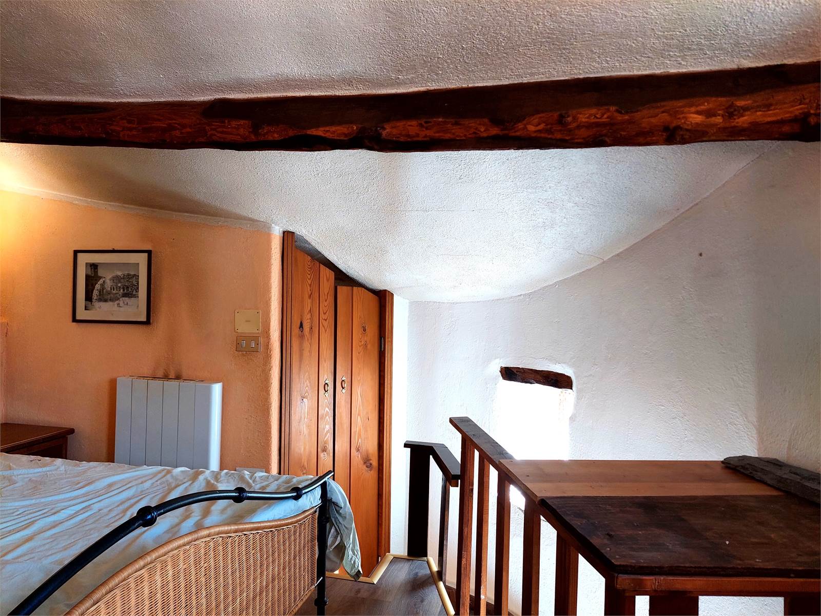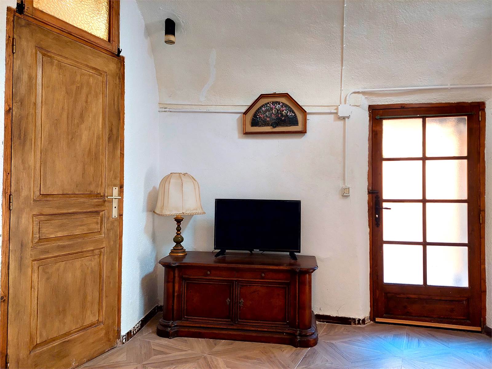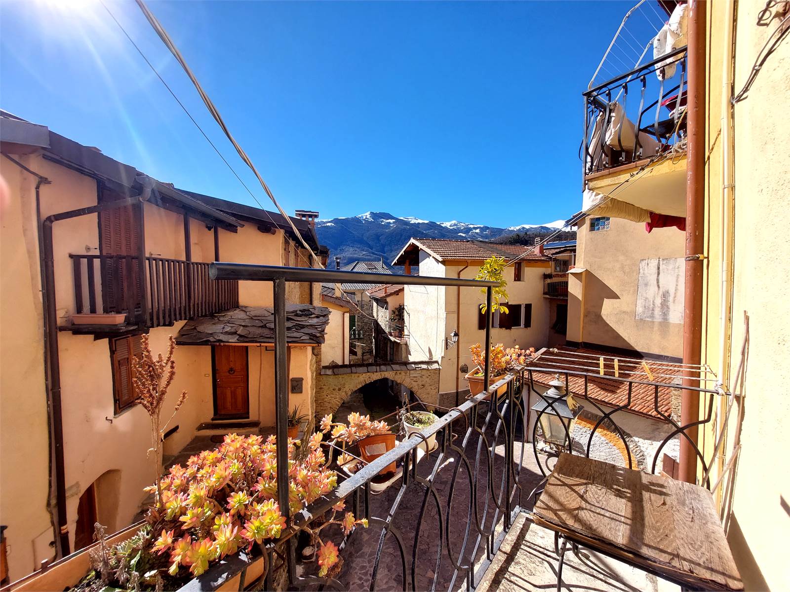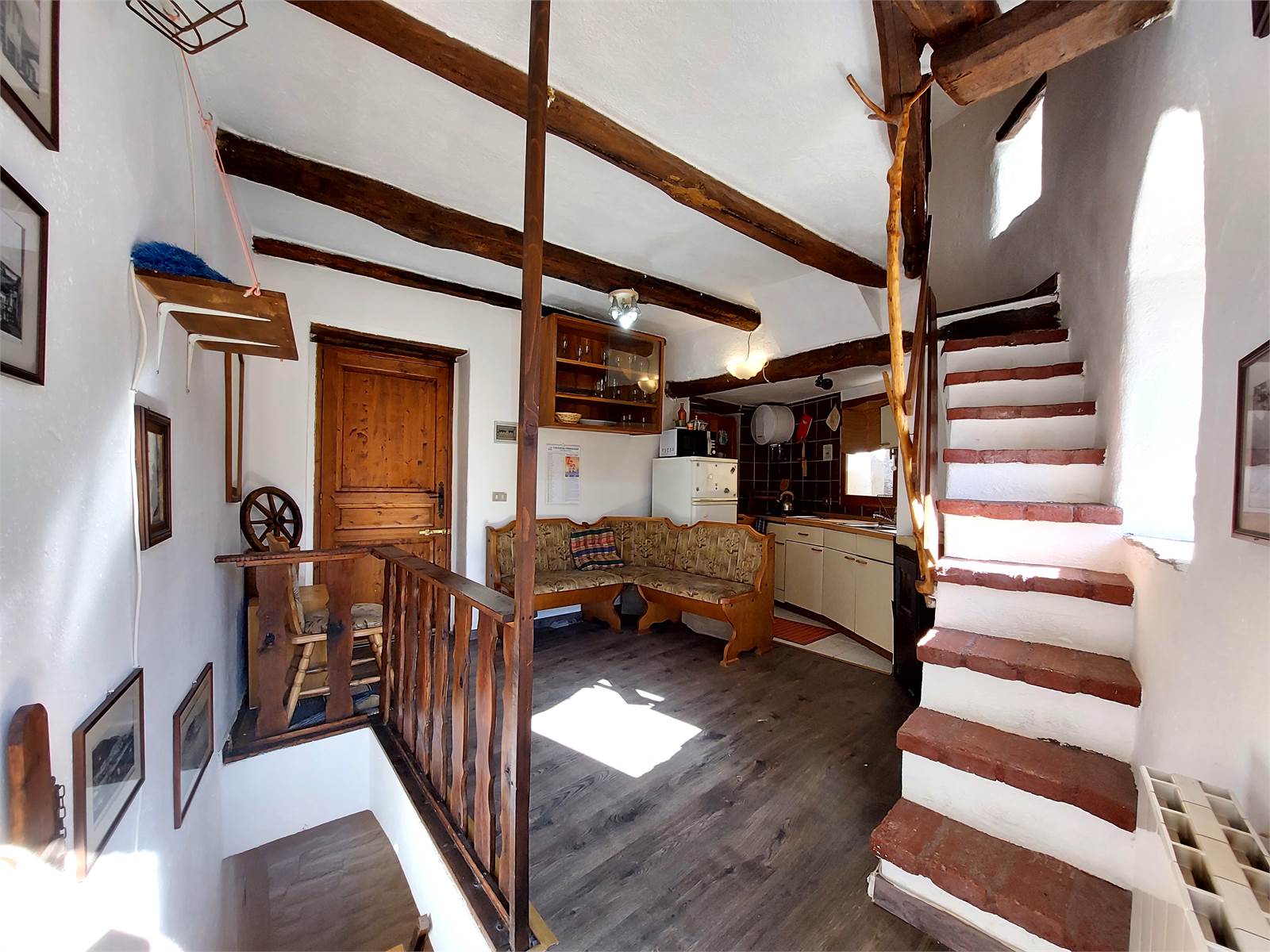 L'ingresso dell'abitazione è indipendente e conduce direttamente nella zona giorno. Soggiorno ed angolo cottura sono suddivisi solo da un muretto a mezz'altezza e hanno la particolarità del soffitto rifinito con travi in legno a vista. L'ambiente è reso luminoso grazie a finestra e porta finestra rivolte a merdione. Il balcone in pietra e ferro battuto gode di vista panoramica sulle montagne e sui tetti del villaggio.