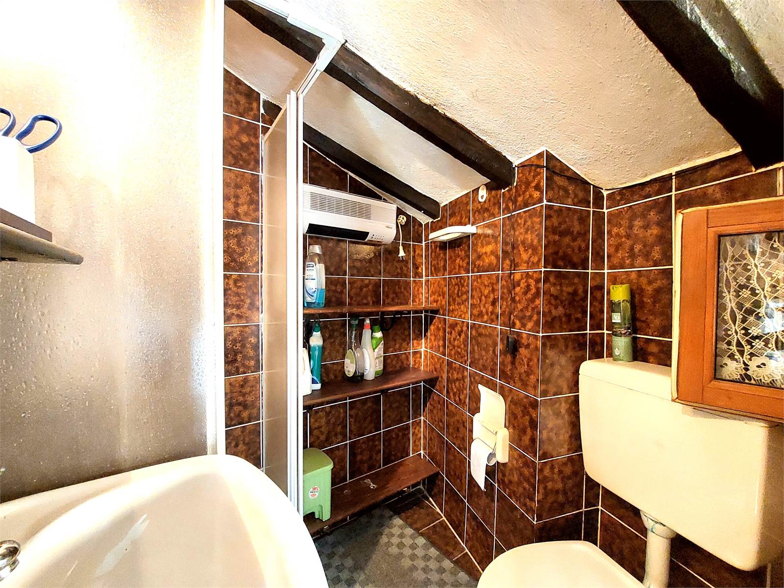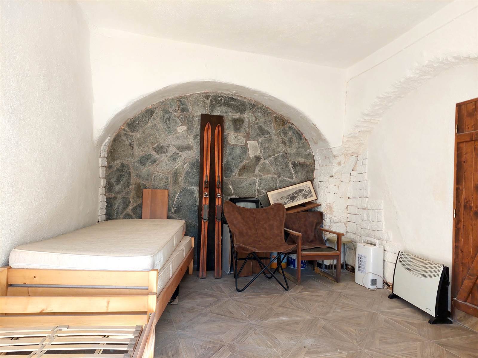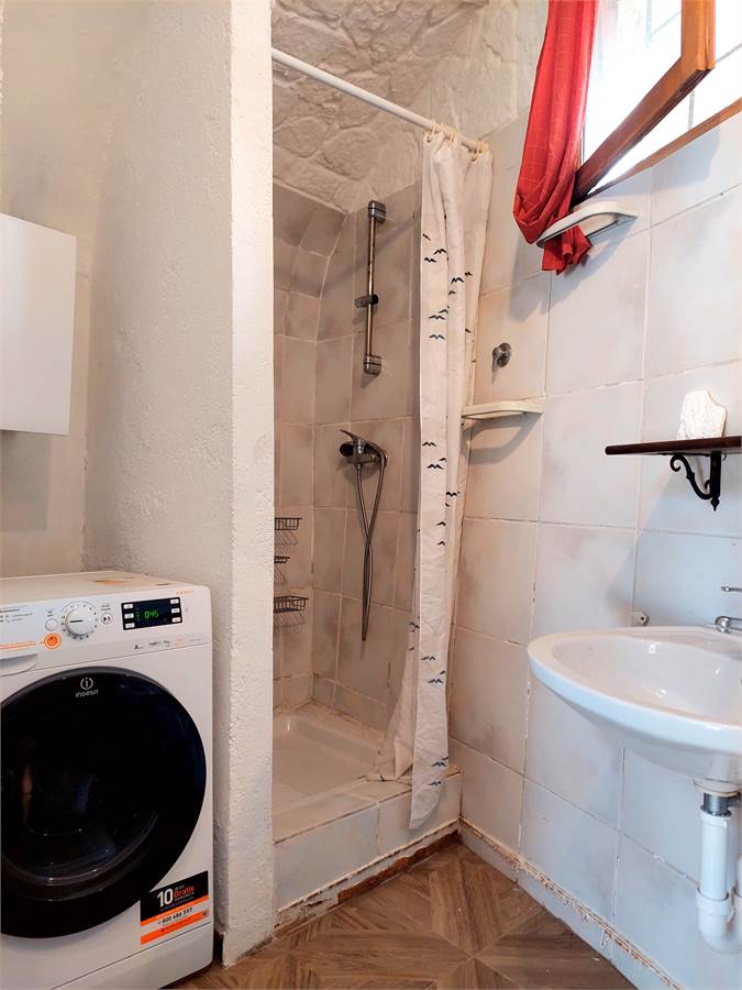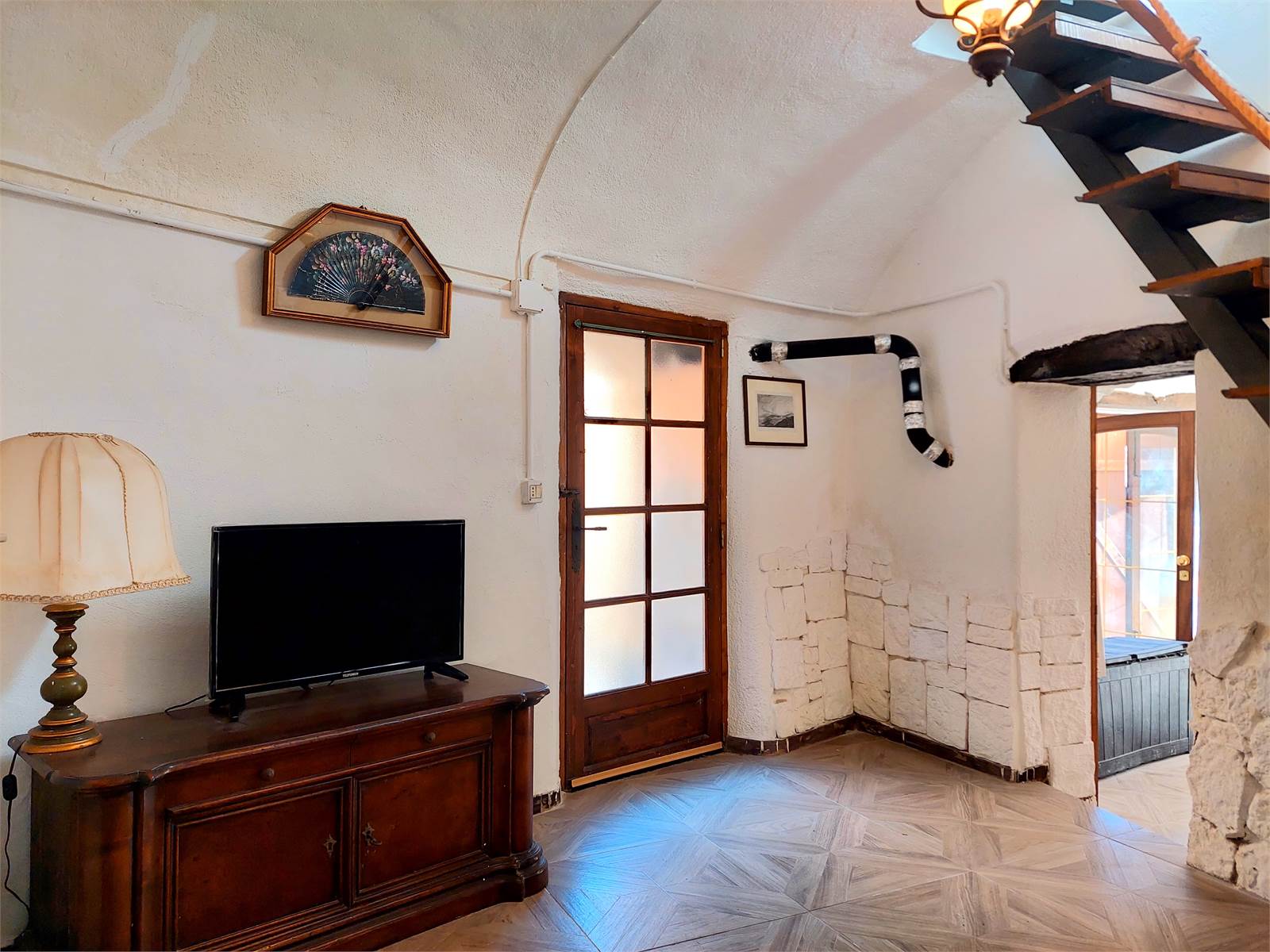 In soggiorno è inoltre presente una seconda scala in muratura che discende al piano seminterrato dell'abitazione. Qui sono presenti due ulteriori vani che hanno una porta d'ingresso ed una vetrata che affacciano sulla piazza del borgo e che possono essere utilizzate come ingressi alternativi. I due vani sono piastrellati ed hanno l'impianto elettrico, quindi possono essere sfruttati come laboratorio, tarvenetta o studio. Al piano seminterrato è infine presente un bagno con finestra e doccia.