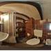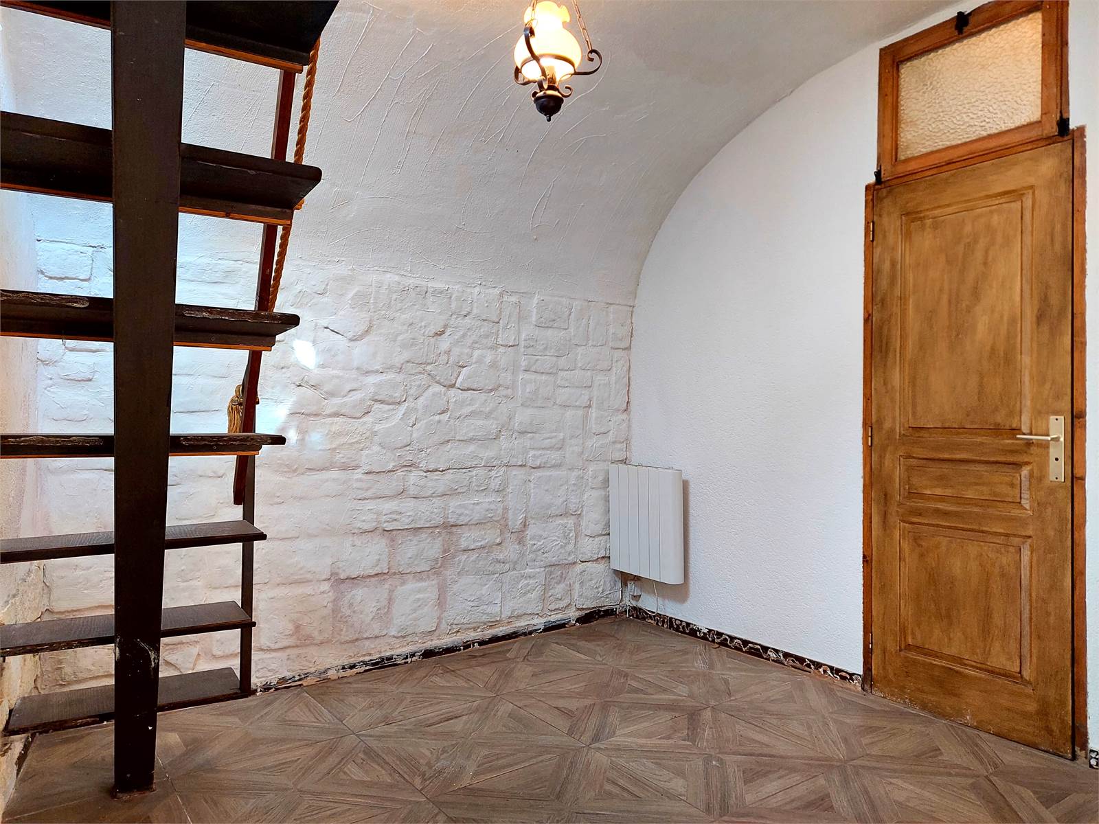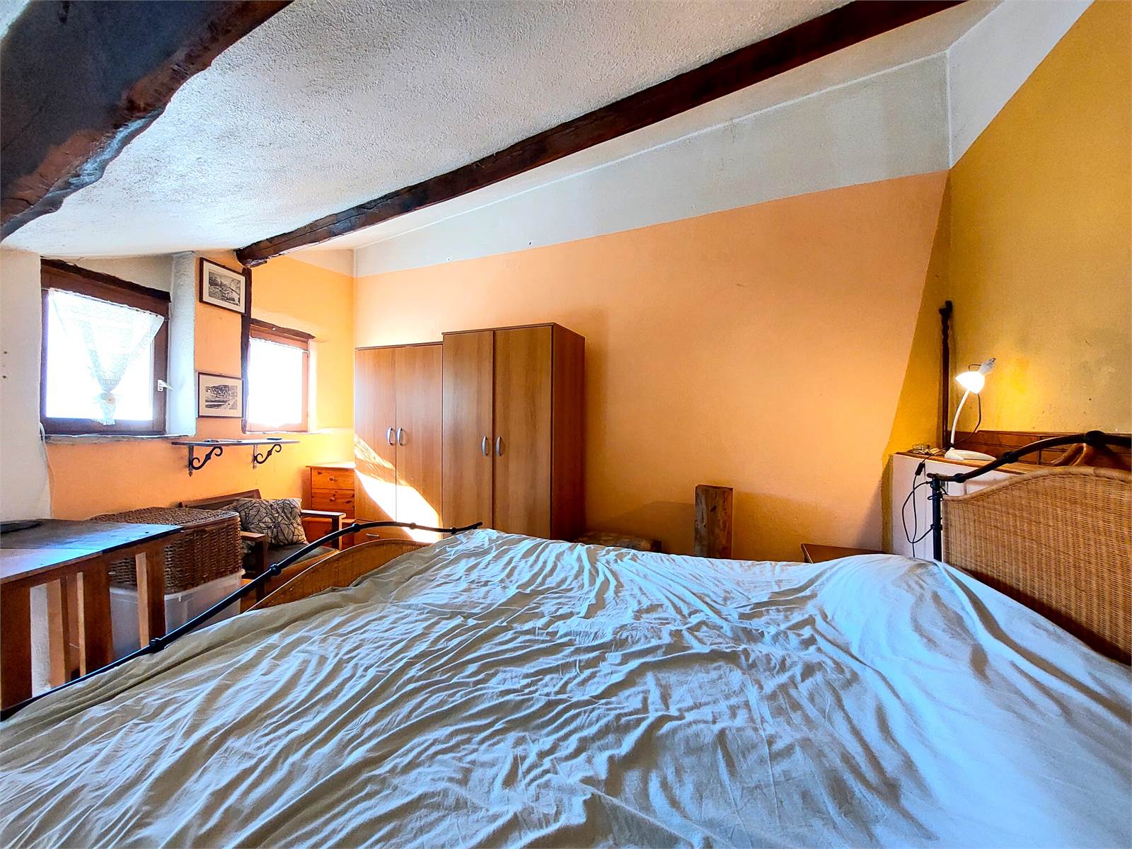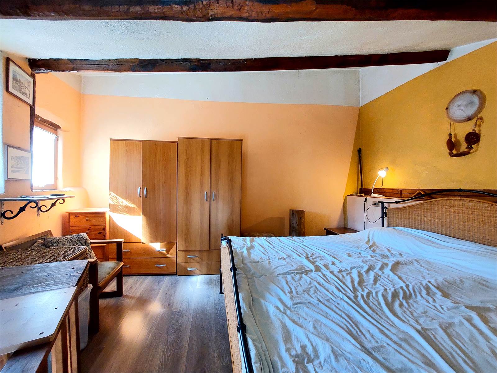 In soggiorno è inoltre presente una seconda scala in muratura che discende al piano seminterrato dell'abitazione. Qui sono presenti due ulteriori vani che hanno una porta d'ingresso ed una vetrata che affacciano sulla piazza del borgo e che possono essere utilizzate come ingressi alternativi. I due vani sono piastrellati ed hanno l'impianto elettrico, quindi possono essere sfruttati come laboratorio, tarvenetta o studio. Al piano seminterrato è infine presente un bagno con finestra e doccia.