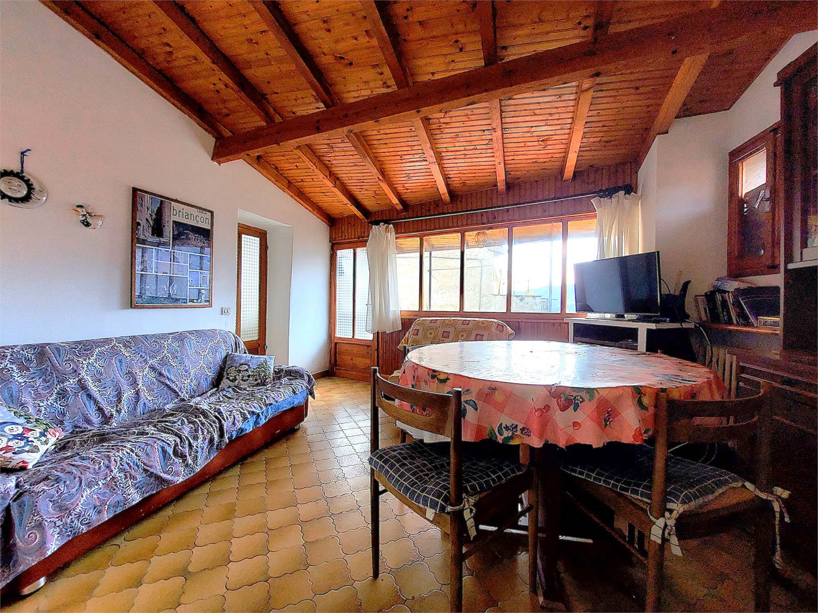 Il primo piano si compone di quattro vani. Cucina e soggiorno sono aperti e direttamente comunicanti fra di loro. La zona giorno è esposta al sole ed ha la finestra che si estende su tutta una parete esterna ed ha accesso al balcone, il quale corre lungo tutta la facciata e dal quale si vedono la vallata sottostante e le cime delle montagne.