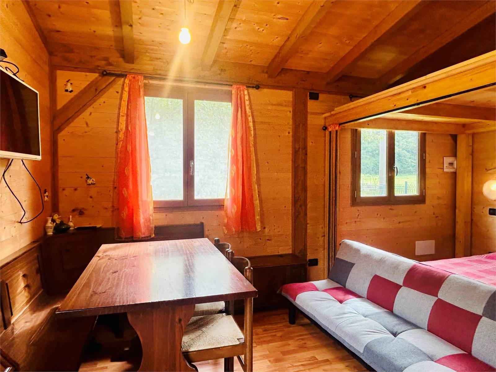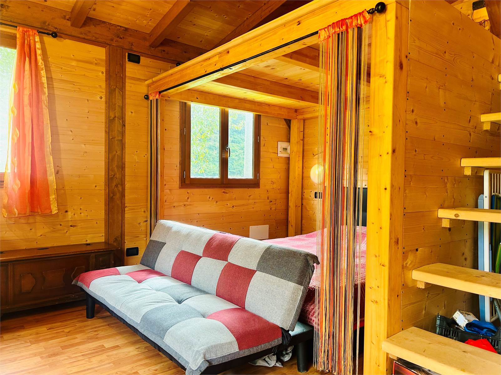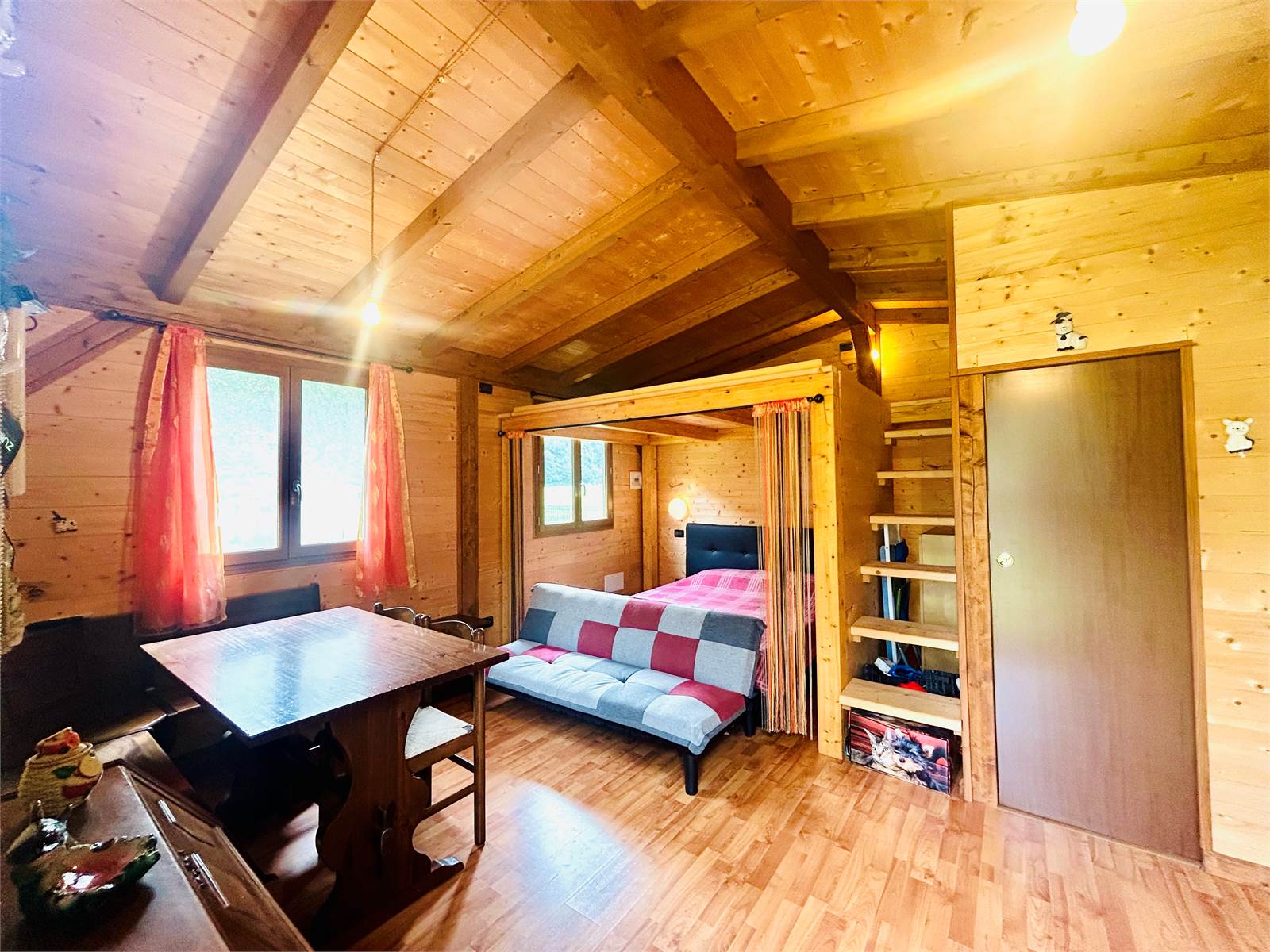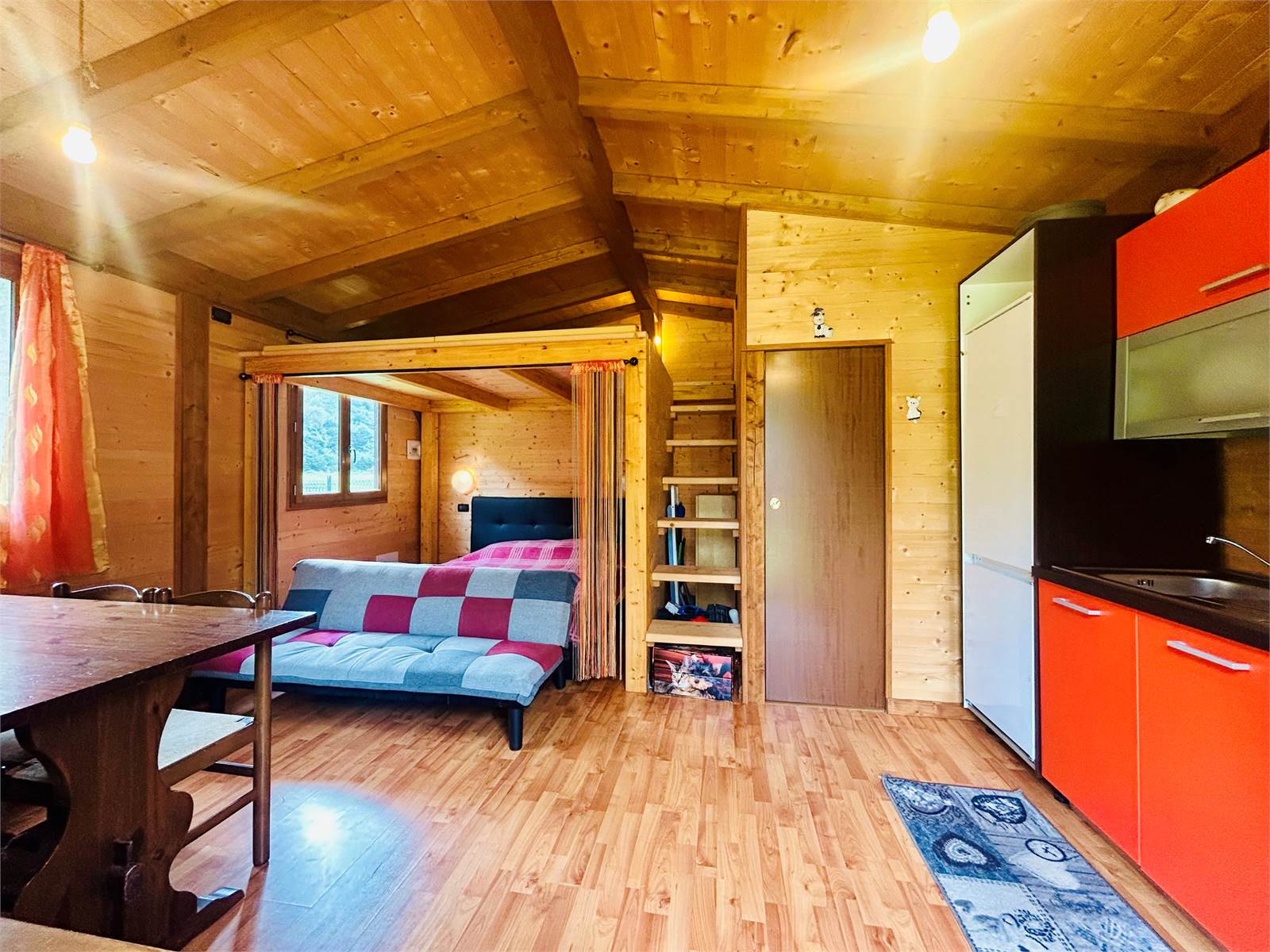 Il locale è suddiviso in zona giorno con cucina a vista e zona notte con letto matrimoniale e soppalco, raggiungibile tramite una graziosa scala in legno.
