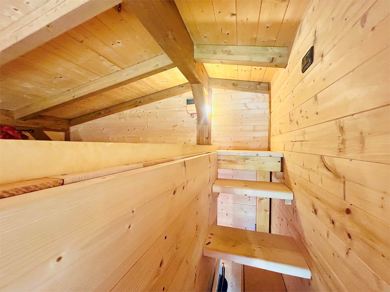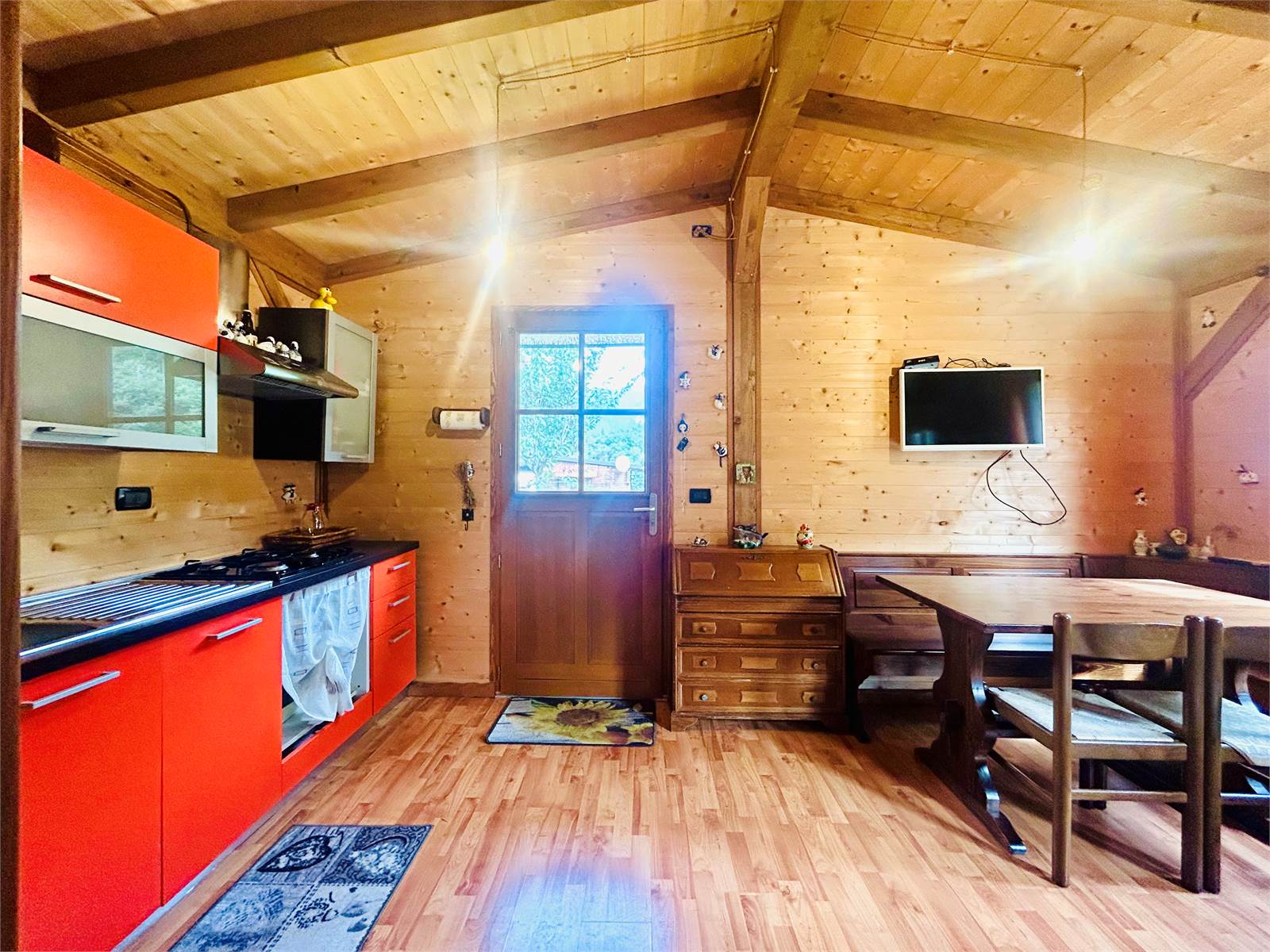 Quattro gradini in legno portano al piano rialzato dove l'ingresso indipendente è direttamente in un a ampio vano con pavimento in parquet in continuità.