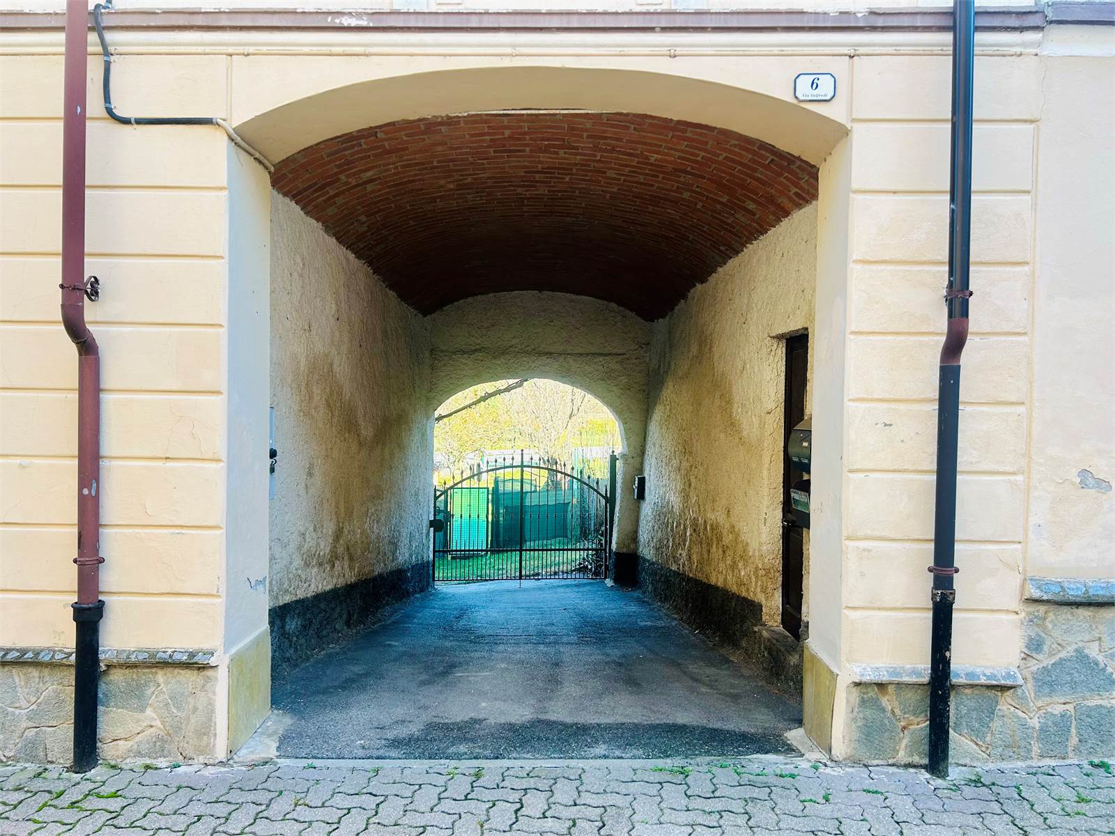 Il garage sottostante il terrazzo, dalle generose dimensioni può ospitare almeno tre auto, il portone d'ingresso in legno ha un'apertura di oltre 4 metri.