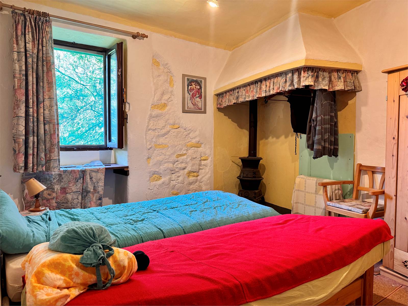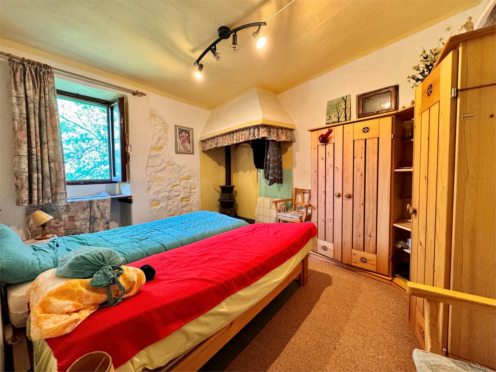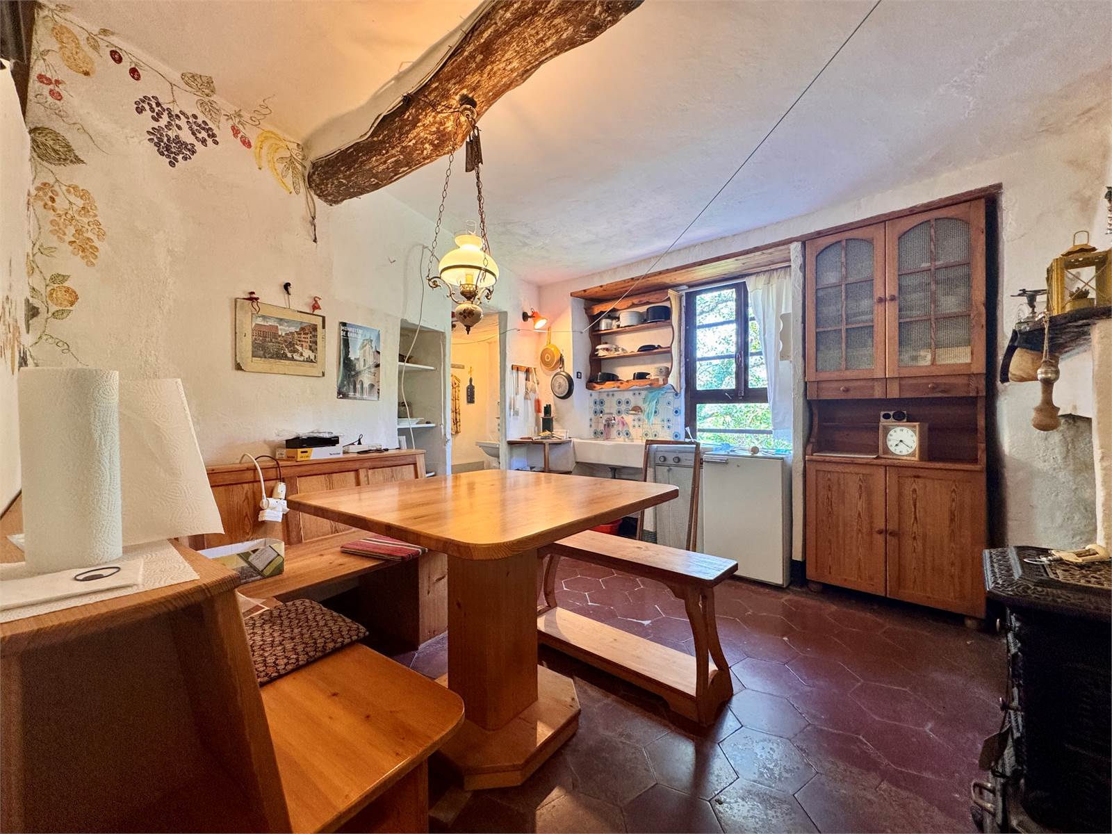 Attualmente la casa non dispone di un sistema di riscaldamento centralizzato, ma è riscaldata tramite alcune stufe a legna presenti nei vari ambienti. L’acqua calda è prodotta da boiler elettrici e gli infissi hanno vetri singoli.