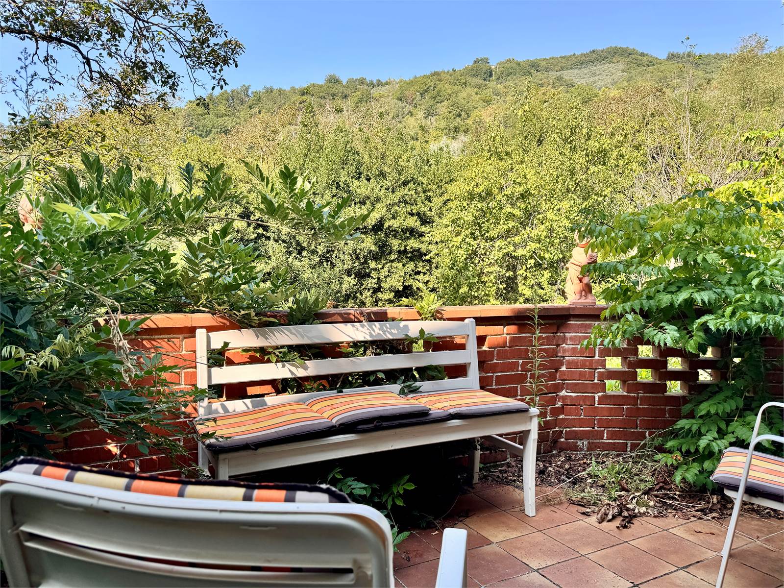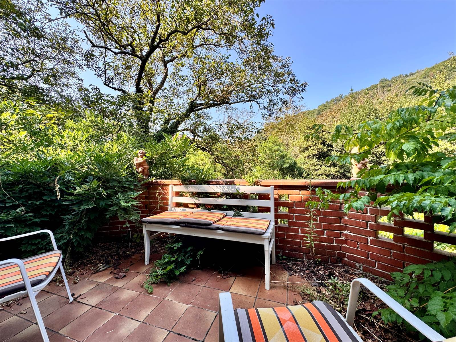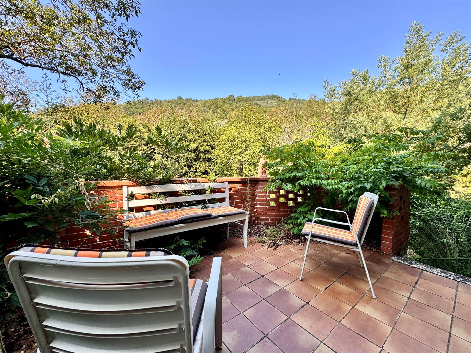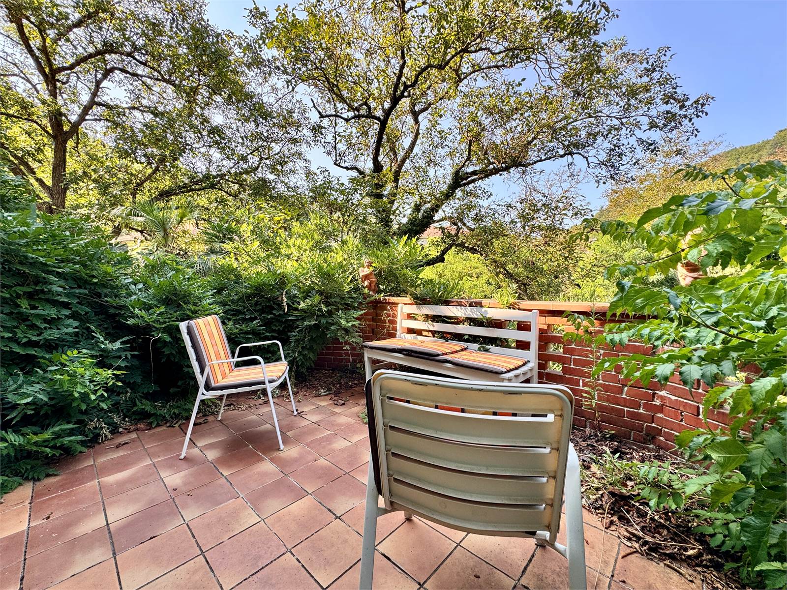 Il giardino di proprietà, di circa 150 metri quadri, è accessibile direttamente dalla terrazza tramite scale esterne. Sotto la terrazza è presente un porticato di ulteriori 15 metri quadri. Inoltre, un cancello consente l’accesso diretto al giardino anche dall'esterno dell’abitazione.