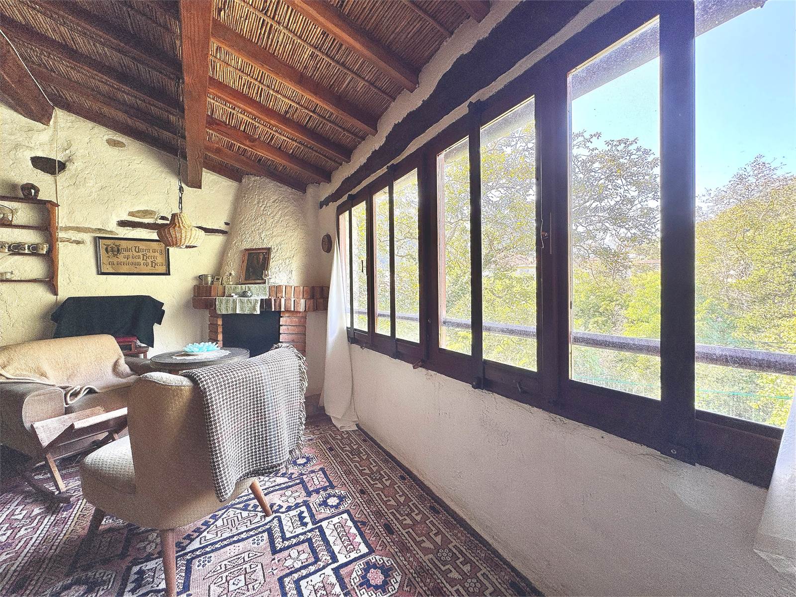 Al secondo piano si trova un ampio e luminoso soggiorno, caratterizzato dalla presenza di un caminetto e da grandi vetrate su tutta la facciata, che offrono un’ottima vista sulla collina.