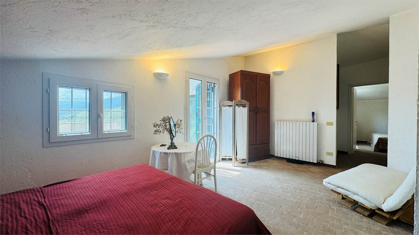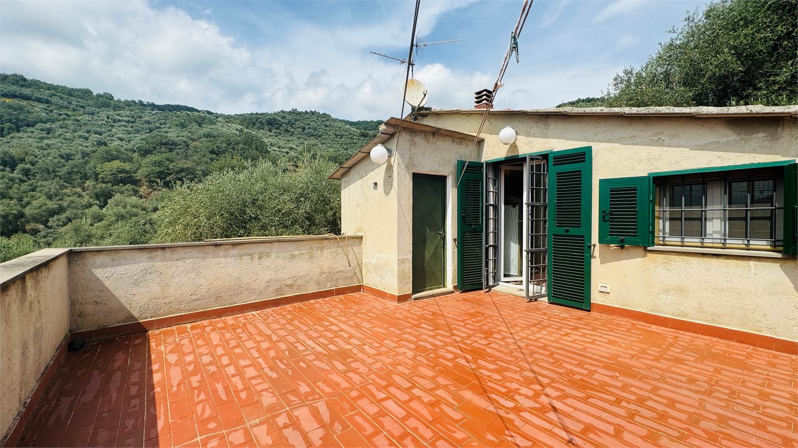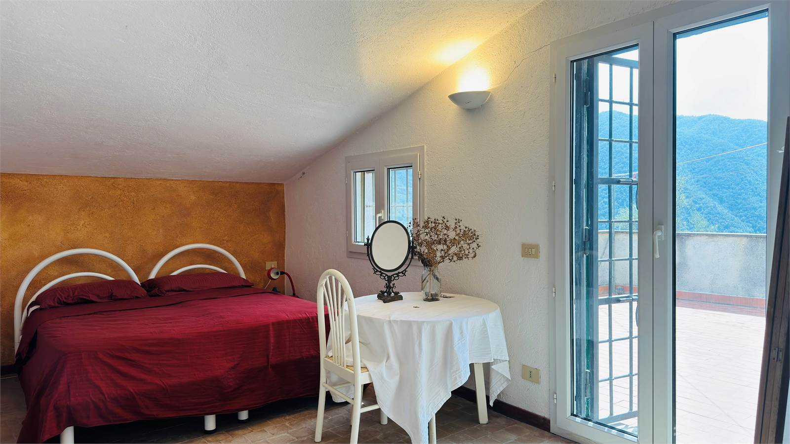 Grazie alle scale interne si accede alla zona notte, composta da due camere matrimoniali e un bagno con box doccia, entrambe le camere sono finestrate e ben esposte, una delle quali con porta finestra dalla quale si esce sul terrazzo di ben venti metri quadri da cui si gode di una vista panoramica sulla valle circostante.