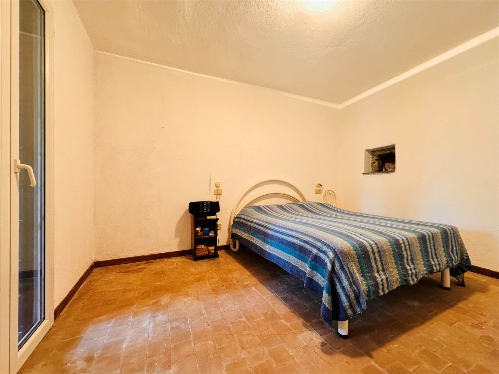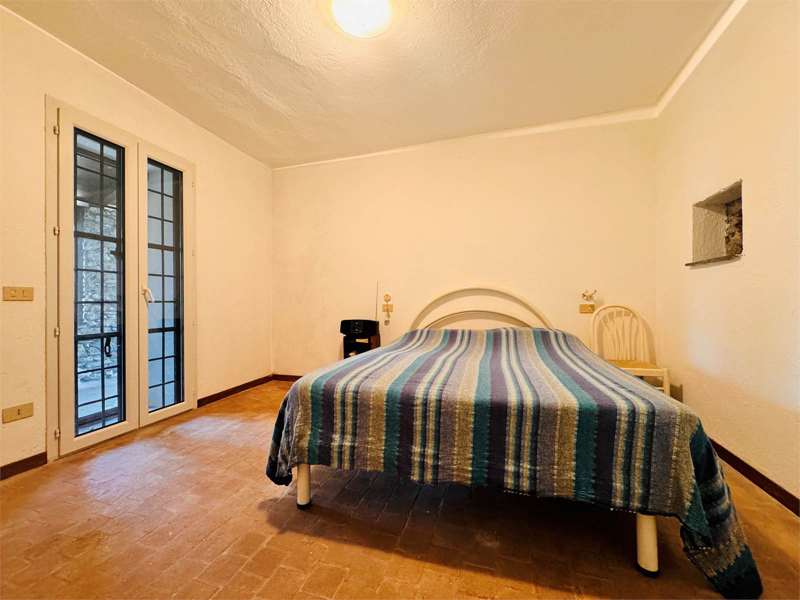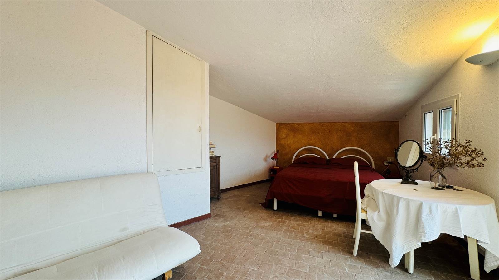 Grazie alle scale interne si accede alla zona notte, composta da due camere matrimoniali e un bagno con box doccia, entrambe le camere sono finestrate e ben esposte, una delle quali con porta finestra dalla quale si esce sul terrazzo di ben venti metri quadri da cui si gode di una vista panoramica sulla valle circostante.