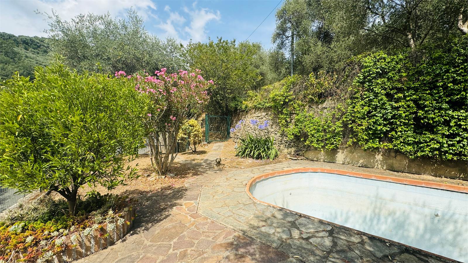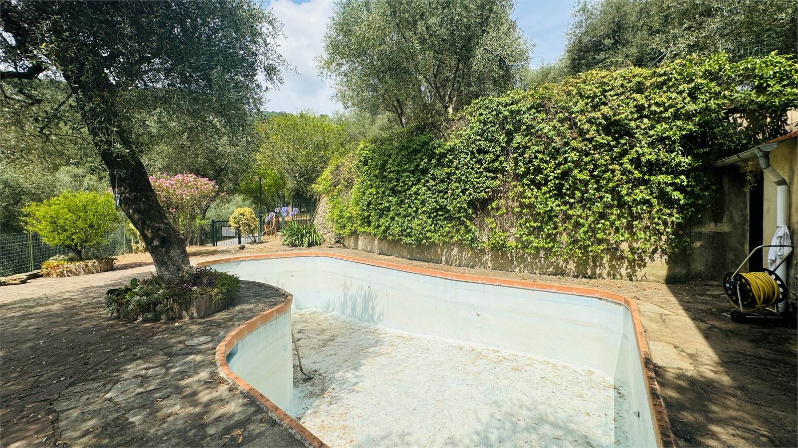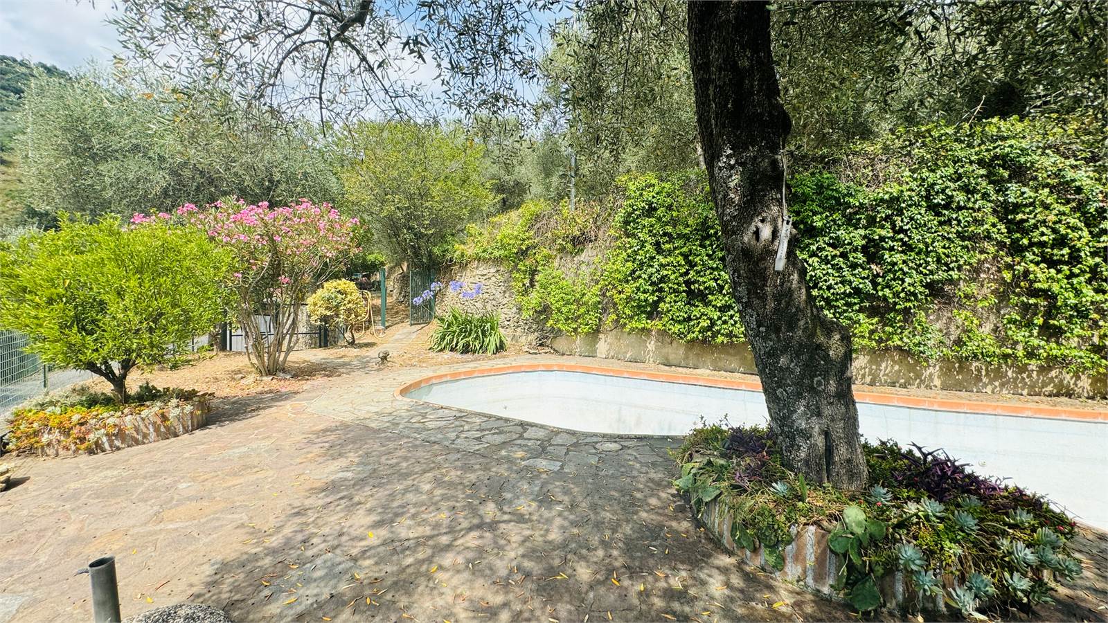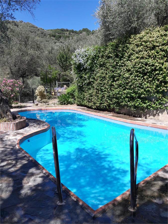Il giardino è caratterizzato da una piscina di circa 25 metri quadri, il tutto è ben curato e mantenuto, con fiori e ulivi così da creare una piacevole ombra naturale senza dover installare tende. Presente inoltre a fianco alla piscina una stanza adibita a spogliatoio con doccia.