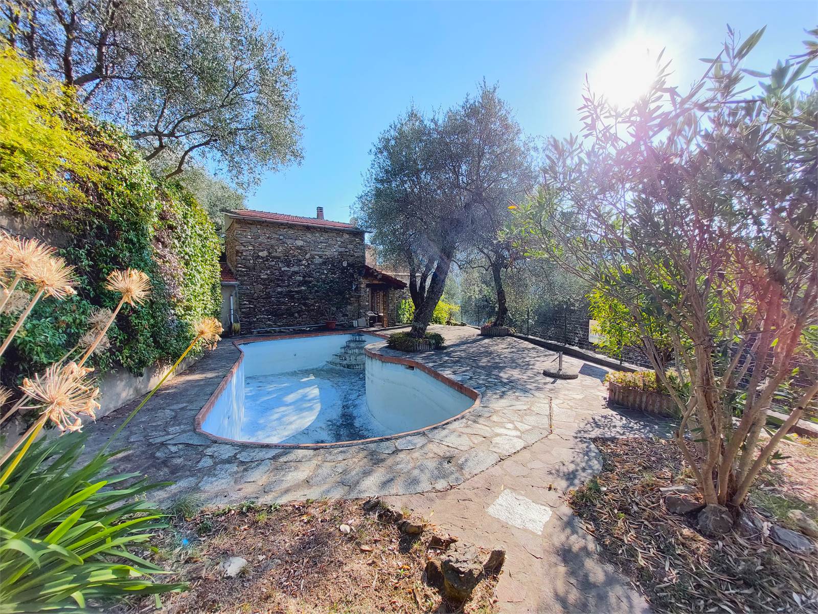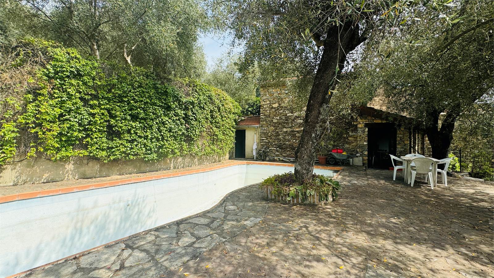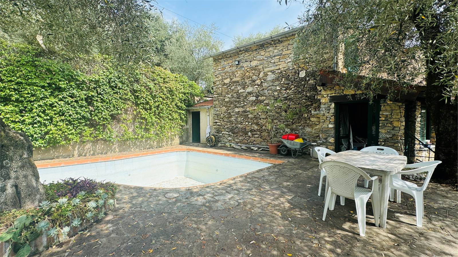 Il giardino è caratterizzato da una piscina di circa 25 metri quadri, il tutto è ben curato e mantenuto, con fiori e ulivi così da creare una piacevole ombra naturale senza dover installare tende. Presente inoltre a fianco alla piscina una stanza adibita a spogliatoio con doccia.