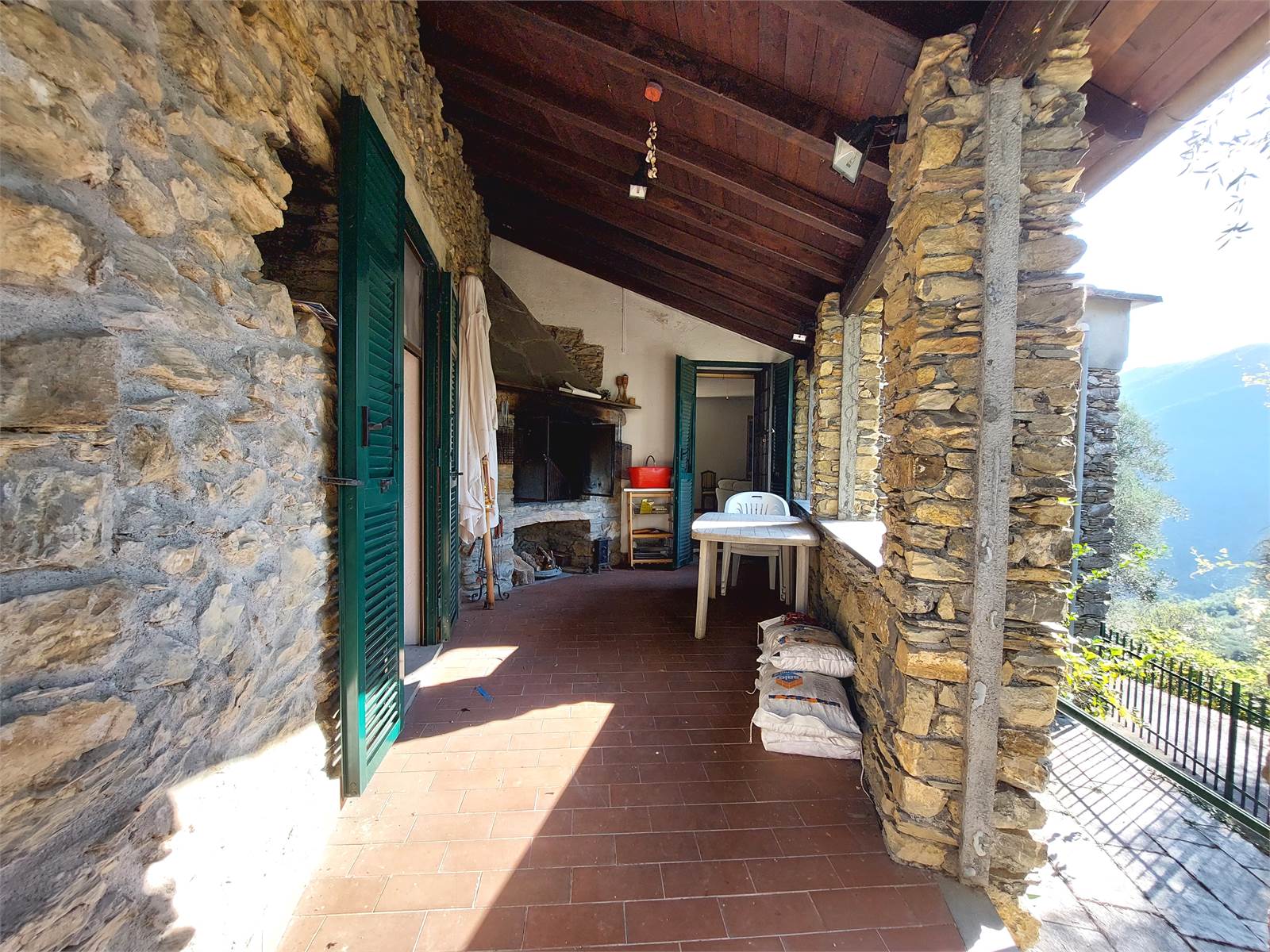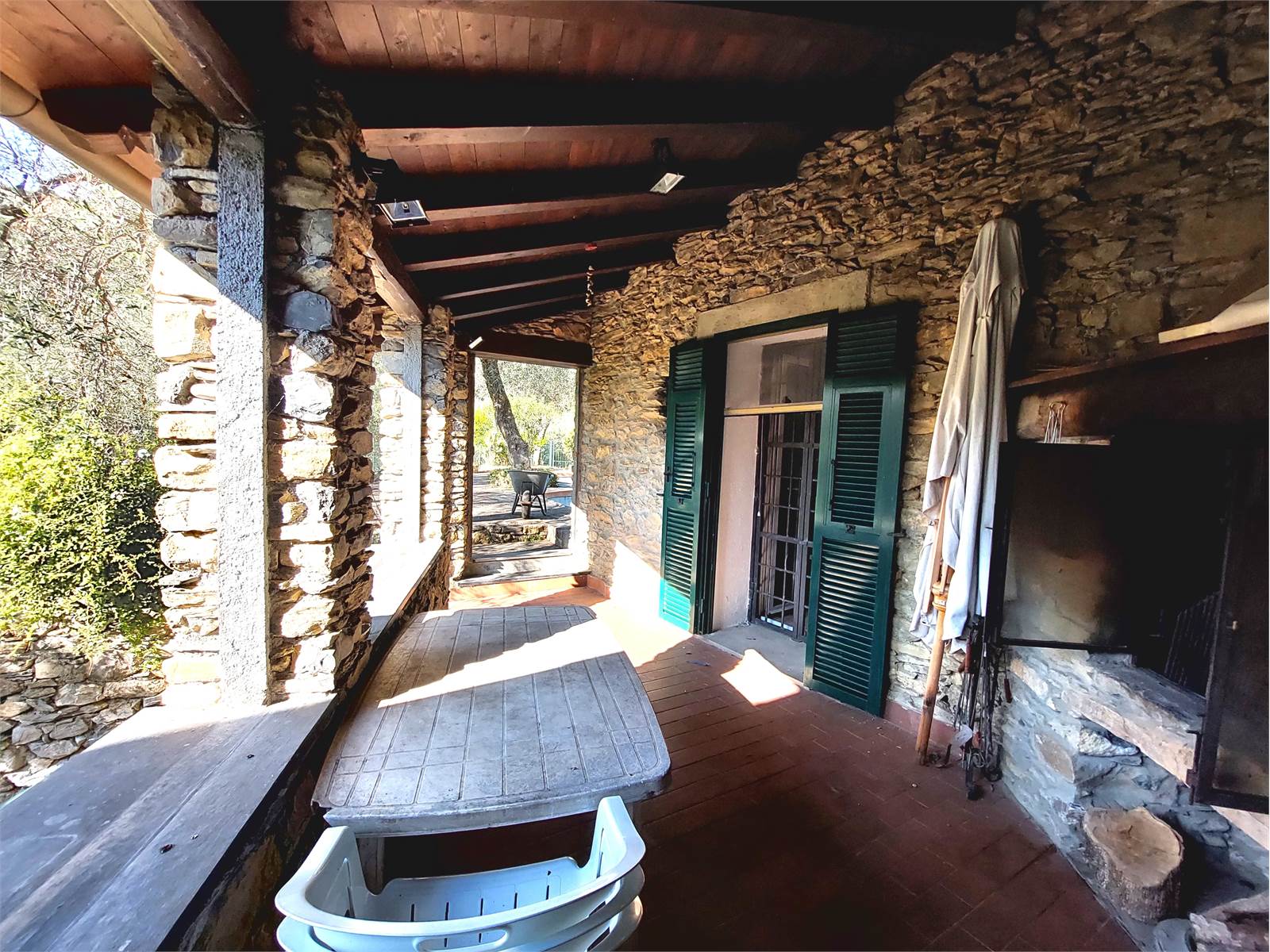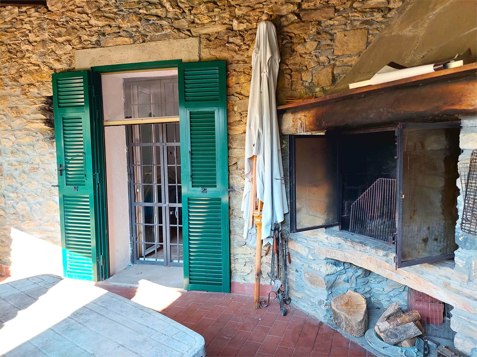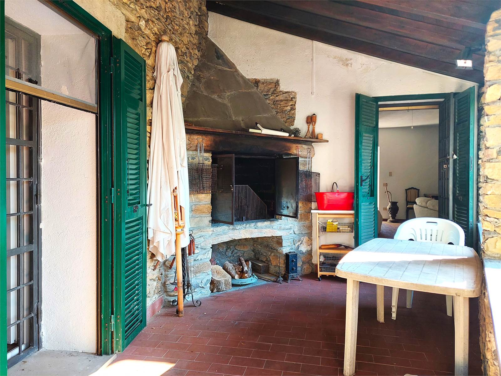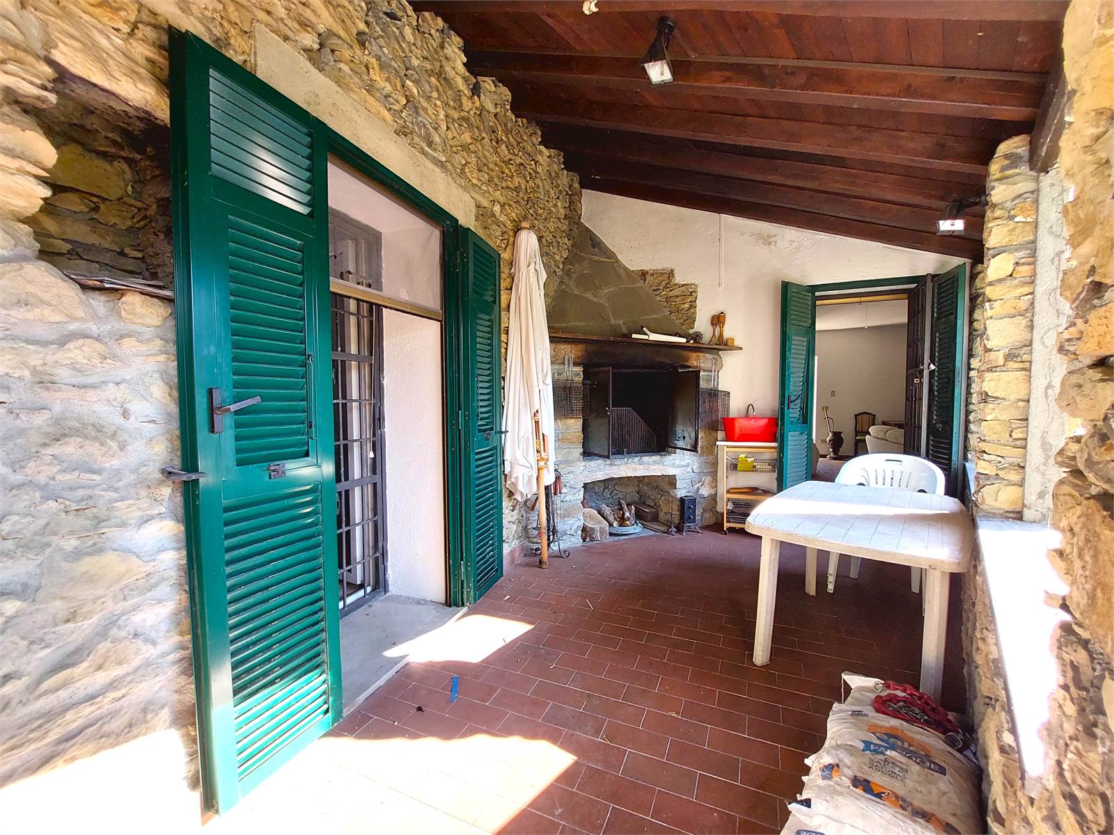 L'ingresso conduce direttamente nella zona giorno composta da un ampio salone con angolo cucina, tramite una porta finestra si accede a un porticato aperto che è accessoriato con un camino in pietra con inserto che può essere utilizzato come forno e barbeque.