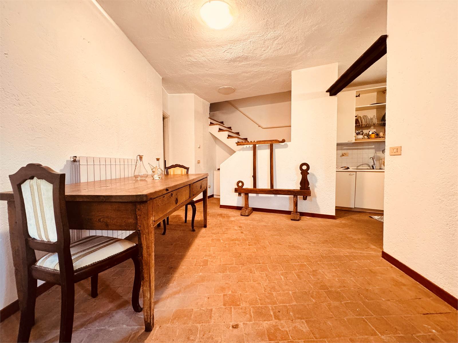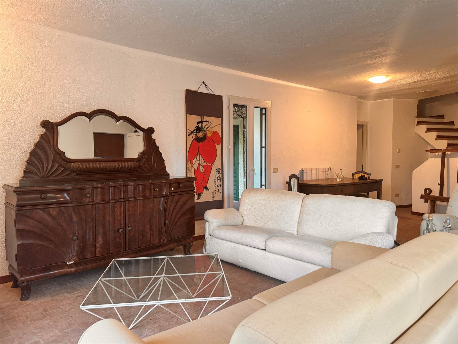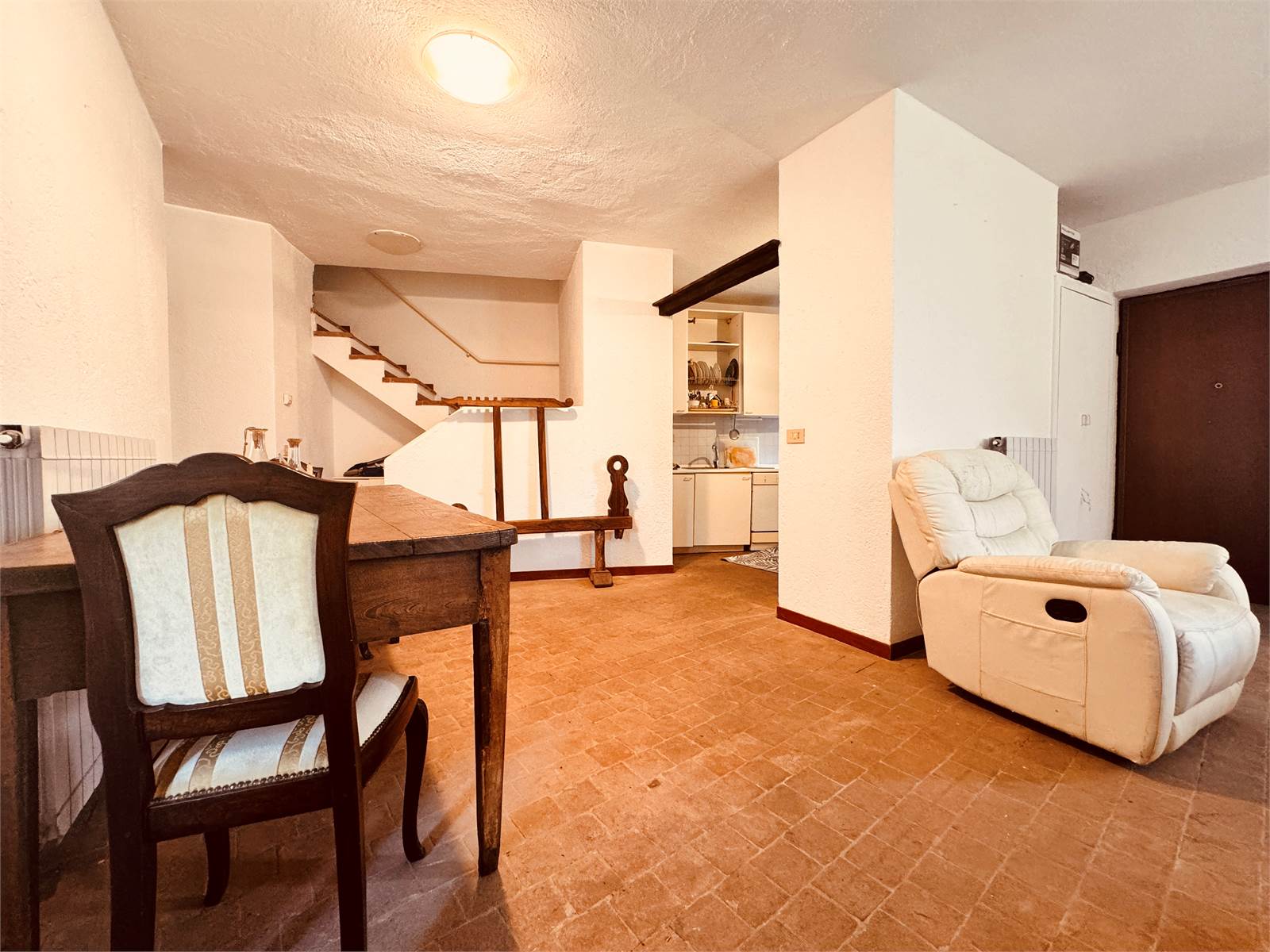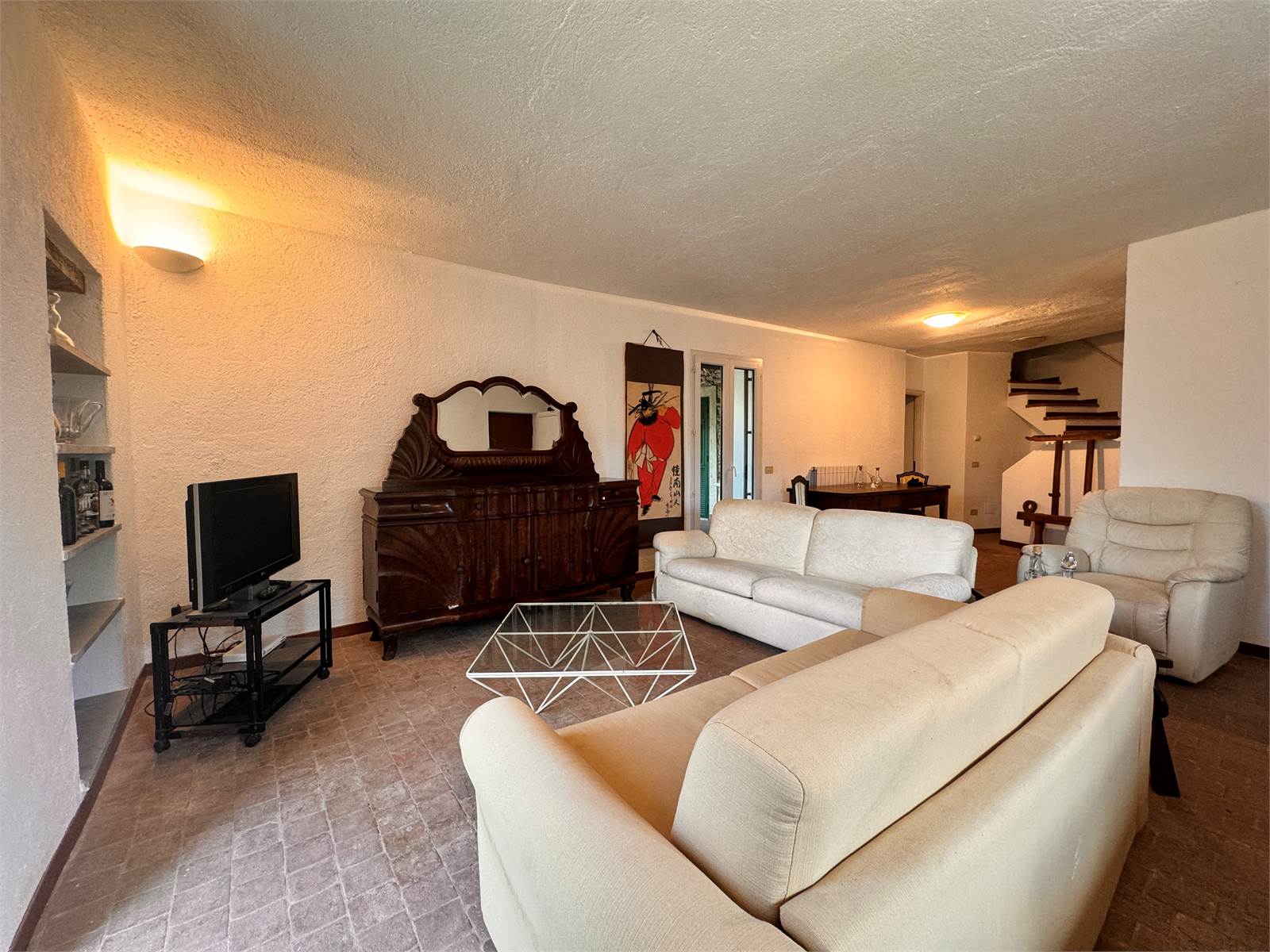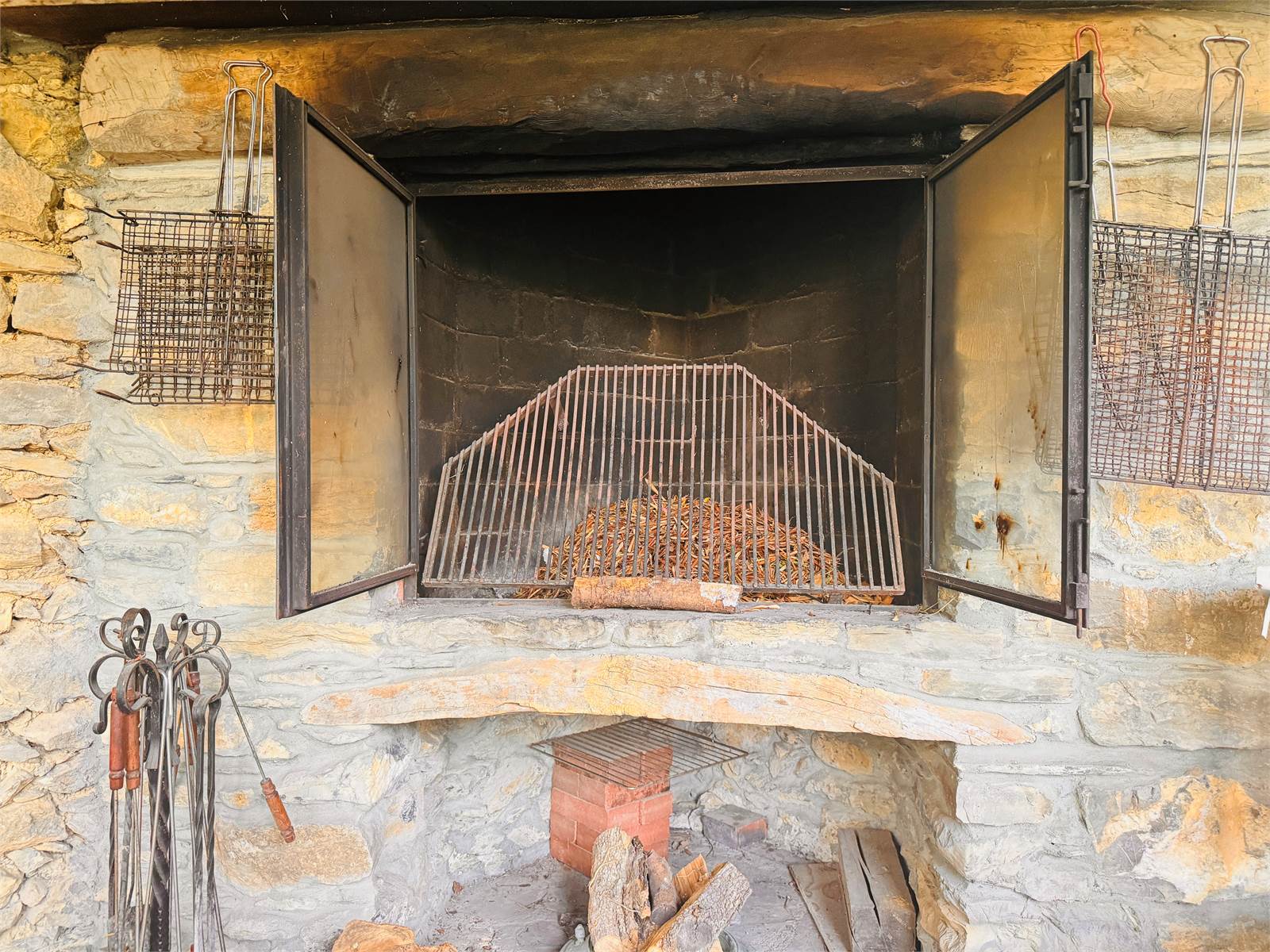 L'ingresso conduce direttamente nella zona giorno composta da un ampio salone con angolo cucina, tramite una porta finestra si accede a un porticato aperto che è accessoriato con un camino in pietra con inserto che può essere utilizzato come forno e barbeque.