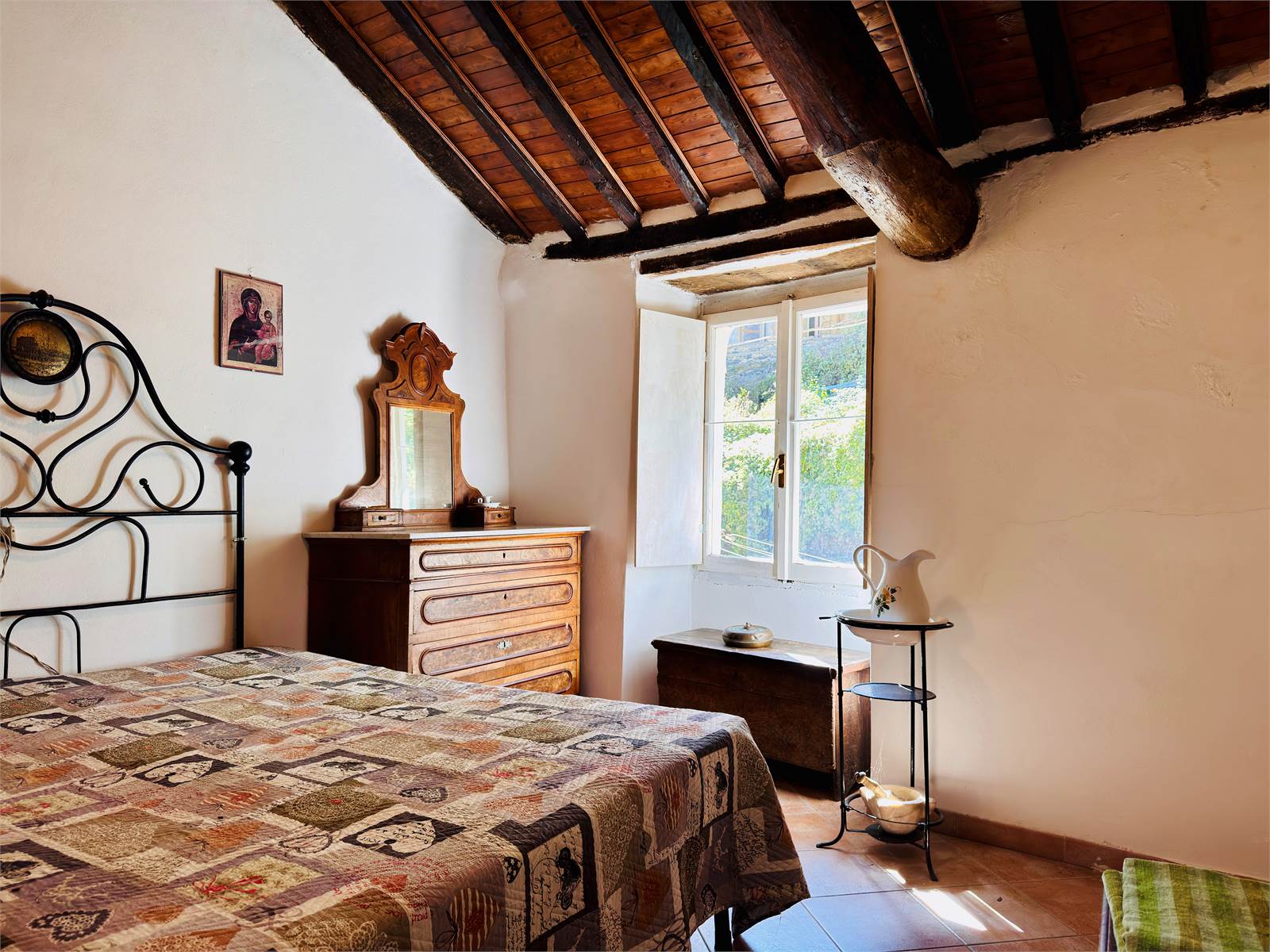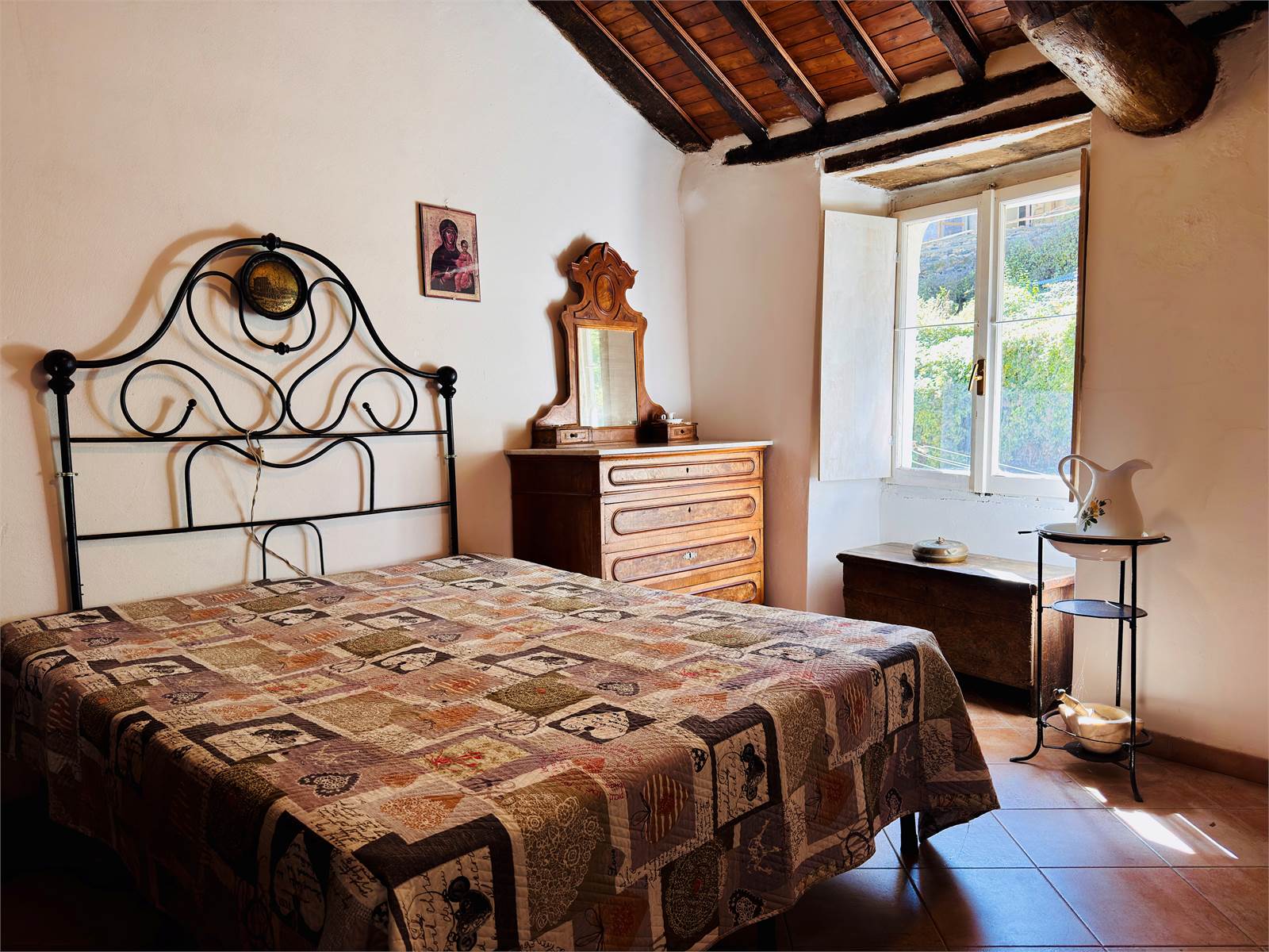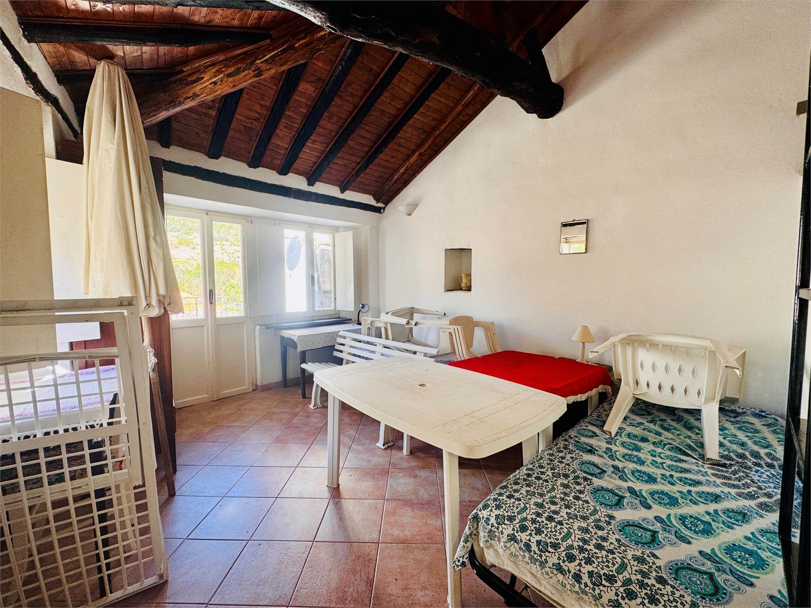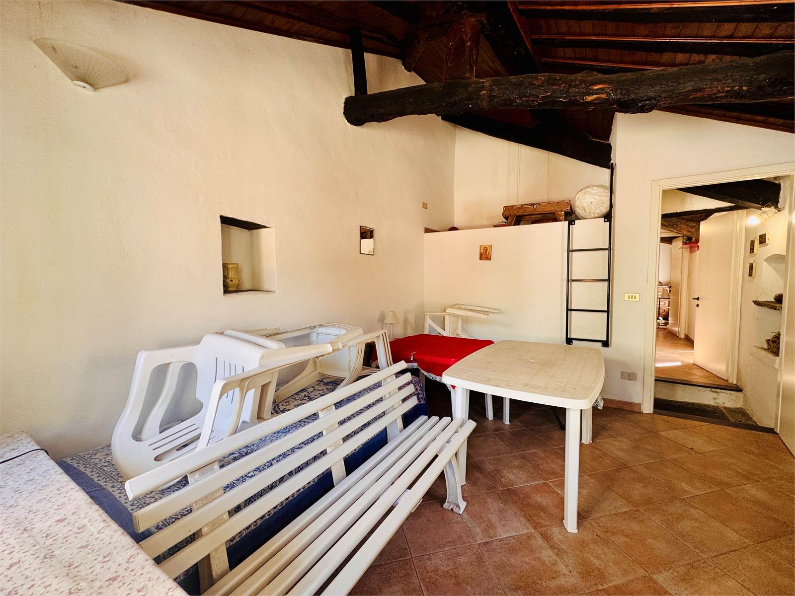 Dal vano d'ingresso precedentemente descritto, la scala interna conduce al secondo piano dell'appartamento. La stanza principale è dotata di predisposizione per creare un angolo cottura ed ha accesso al terrazzo. Quest'ultimo misura circa 15 metri quadrati ed ha la vista aperta sulle montagne circostanti. La camera da letto è matrimoniale ed ha i soffitti con travi in legno a vista. Il bagno è cieco ed è dotato di doccia.