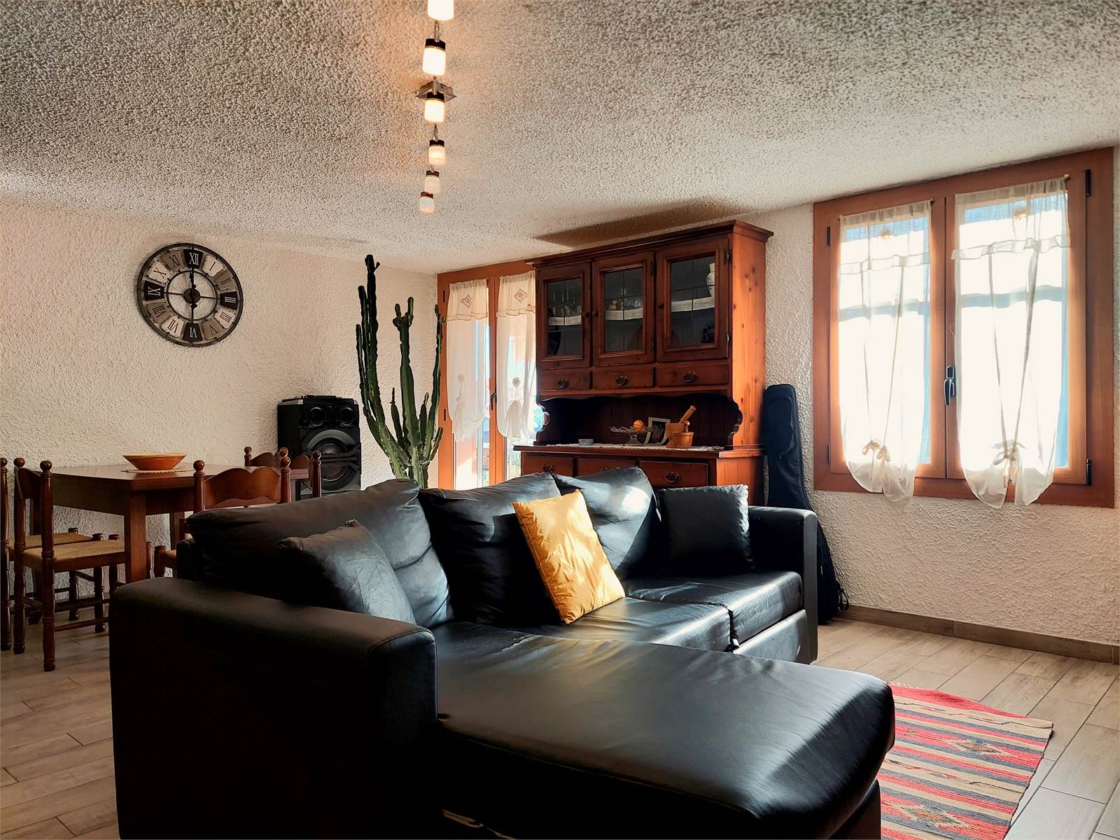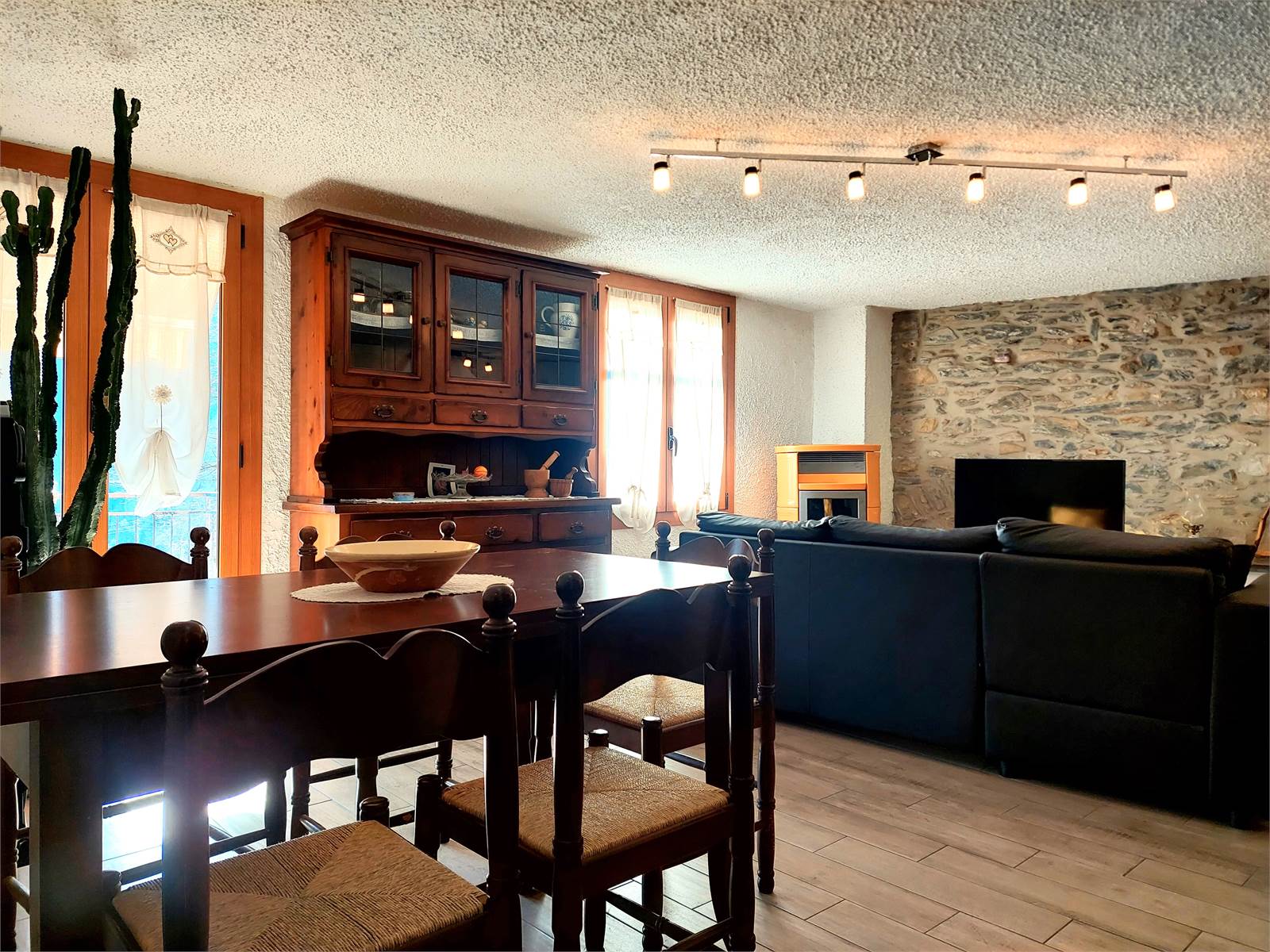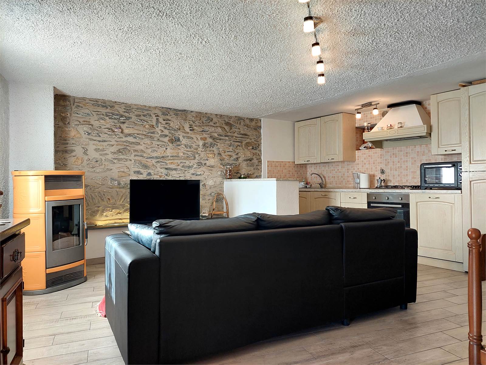 La zona giorno è al piano terra ed è costituita da una taverna con cucina a vista utilizzata sia come soggiorno che come sala da pranzo. La zona giorno ha accesso diretto al terrazzo, che misura circa 15 metri quadrati ed ha vista panoramica sulle montagne.
