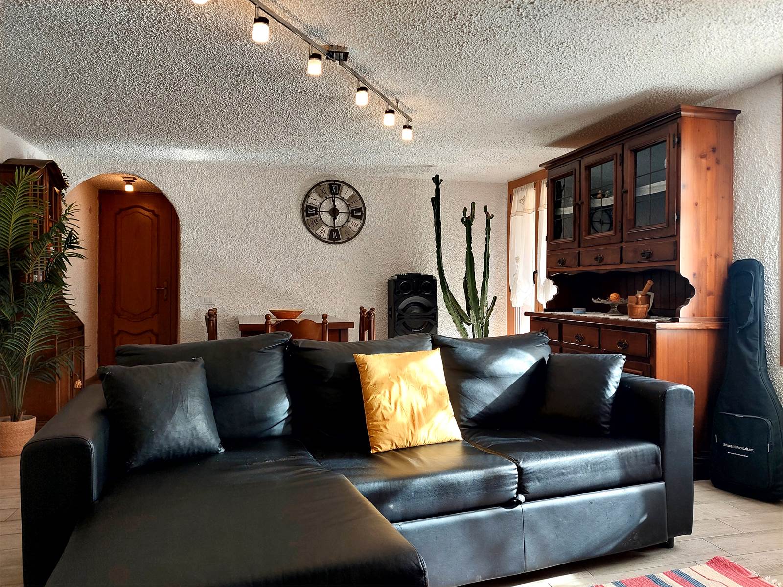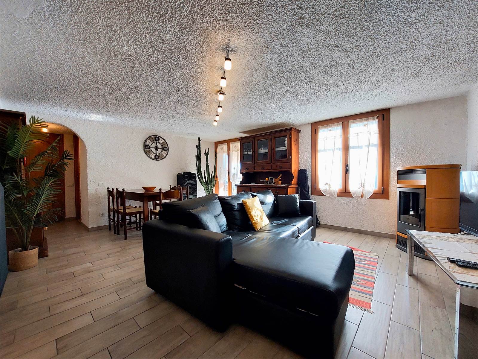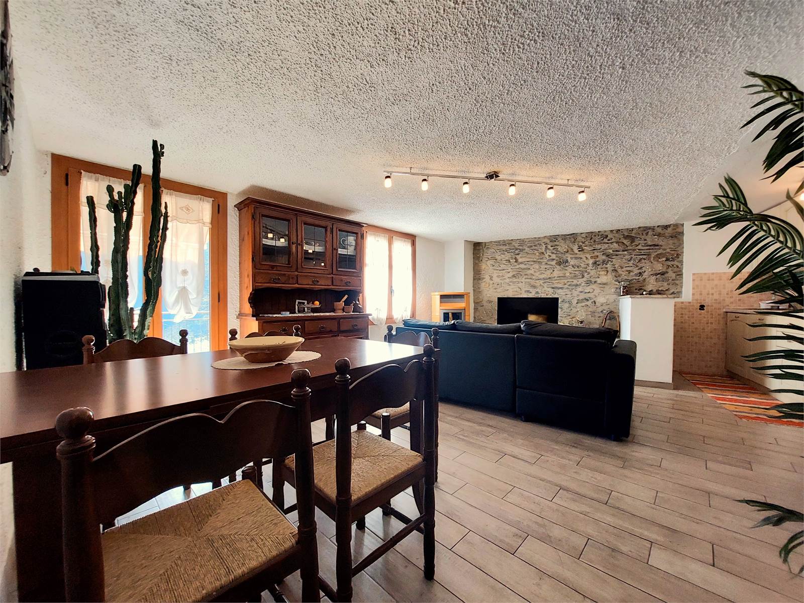 La zona giorno è al piano terra ed è costituita da una taverna con cucina a vista utilizzata sia come soggiorno che come sala da pranzo. La zona giorno ha accesso diretto al terrazzo, che misura circa 15 metri quadrati ed ha vista panoramica sulle montagne.